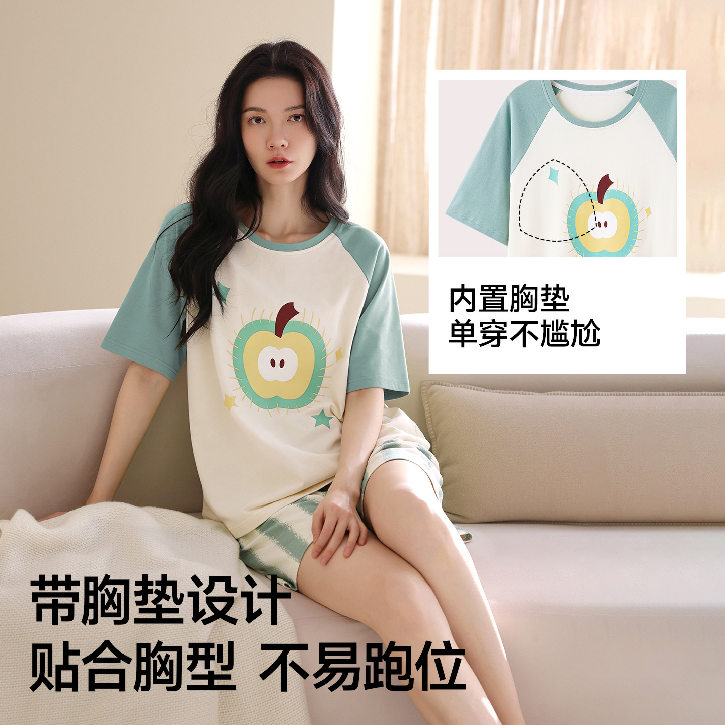 猫人夏季新款纯棉女士睡衣印花短袖家居服套装亲肤带胸垫可外穿