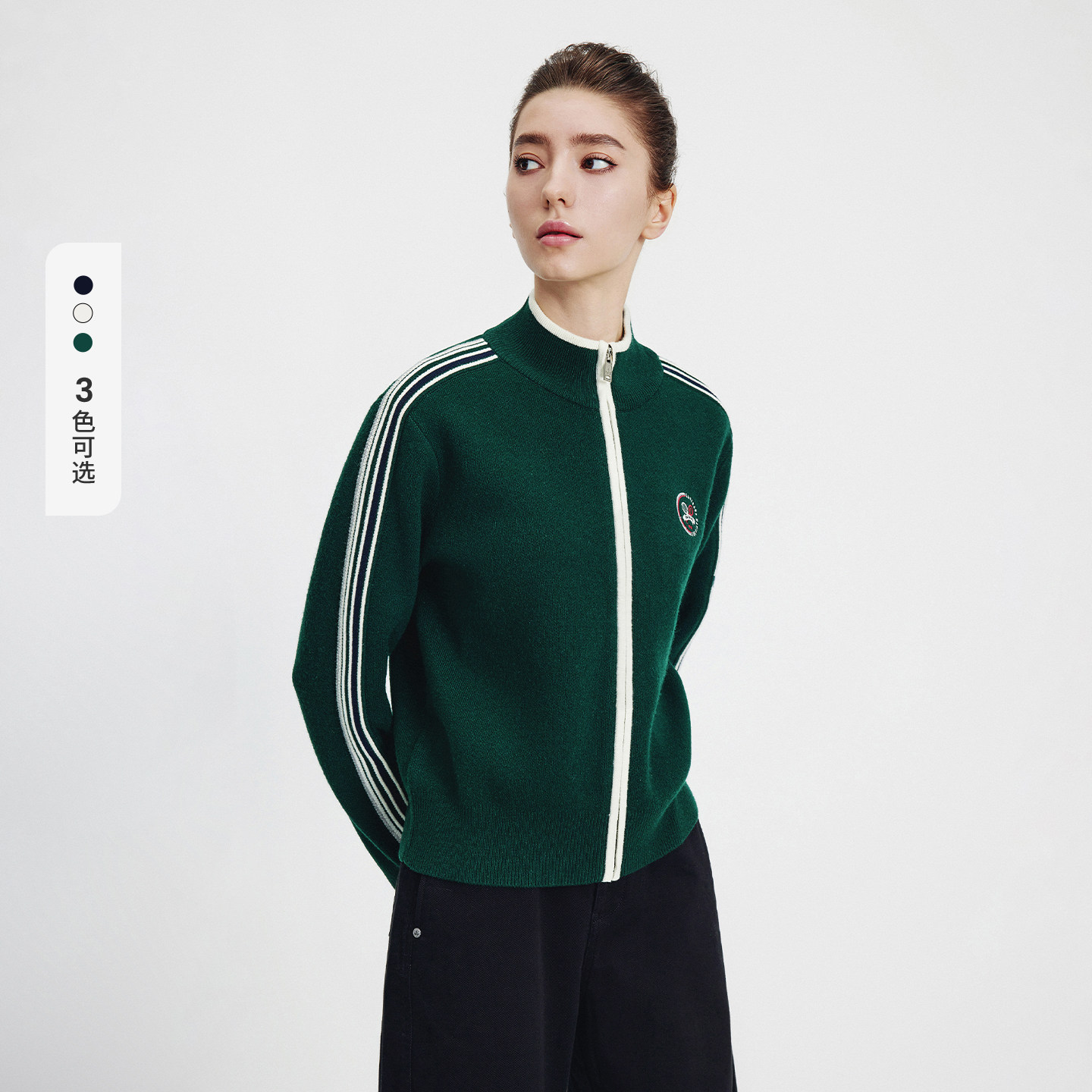 Navigare意大利小帆船绿色羊毛针织衫女士秋季新款休闲开衫毛衣