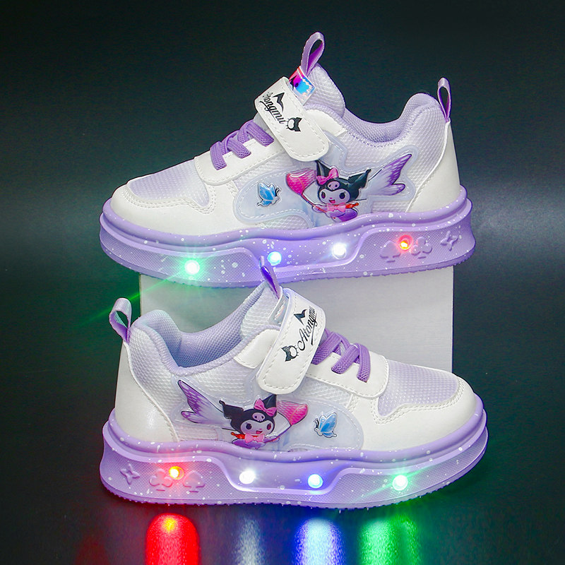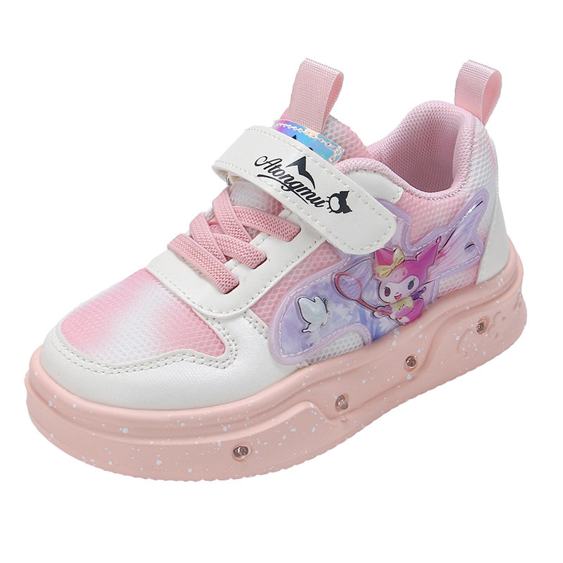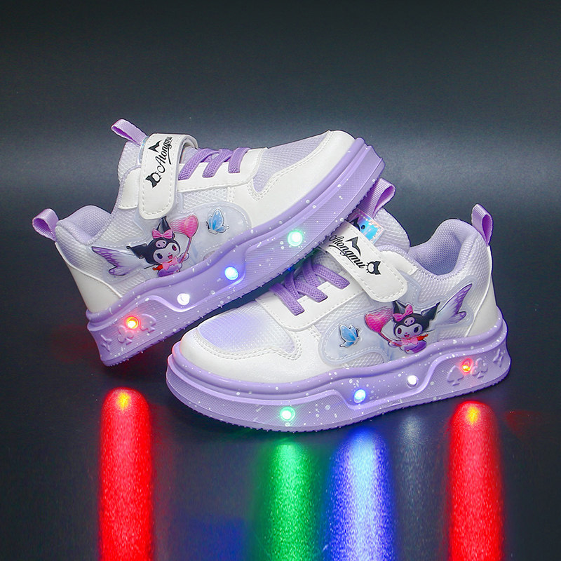 女童发光运动鞋卡通魔术贴亮灯鞋儿童轮滑鞋粉色透气库洛米带灯鞋