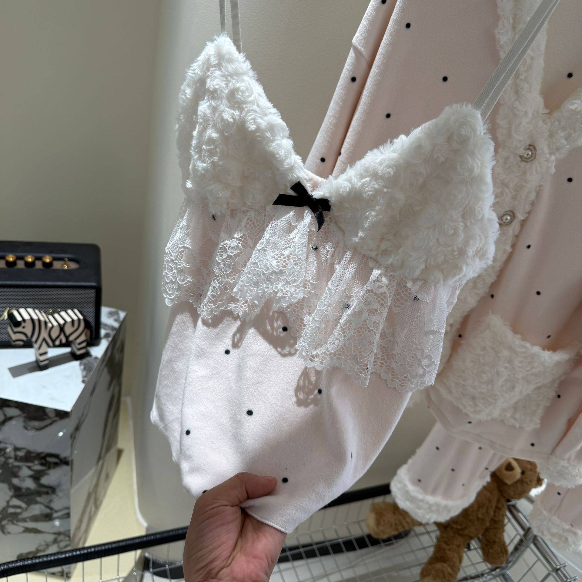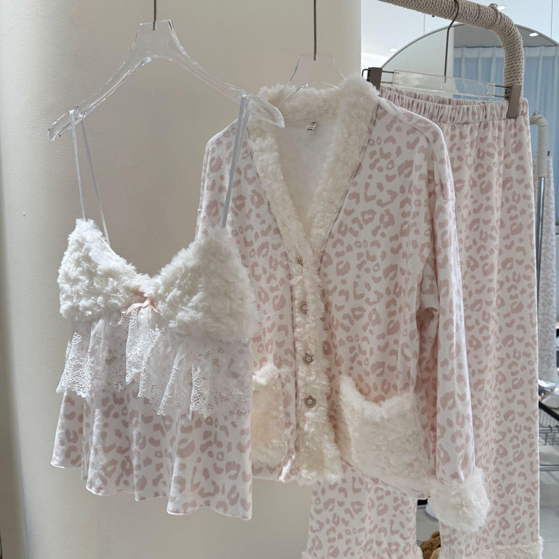 海岛绒睡衣女秋冬三件套纯欲甜美风2025新款带胸垫波点外穿家居服