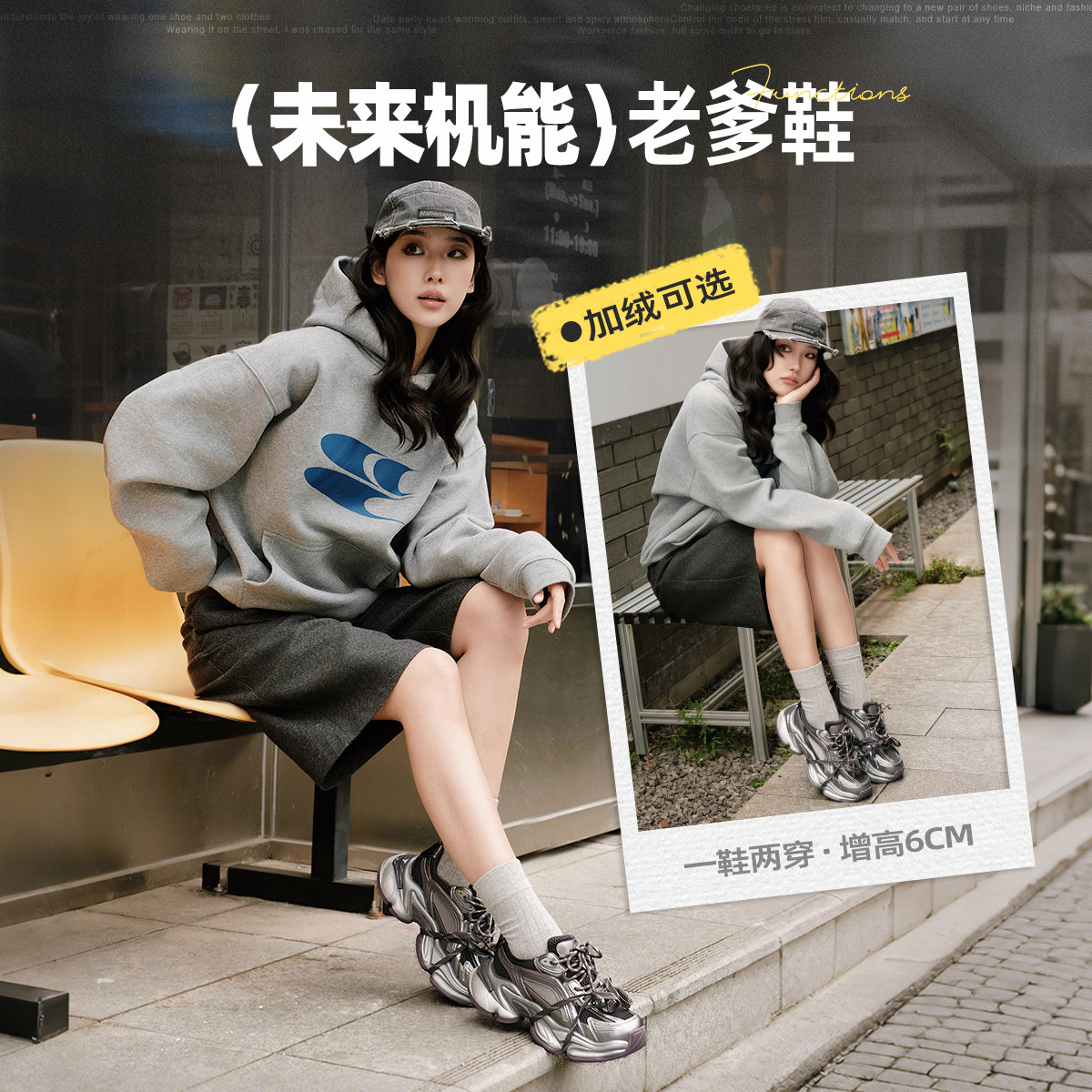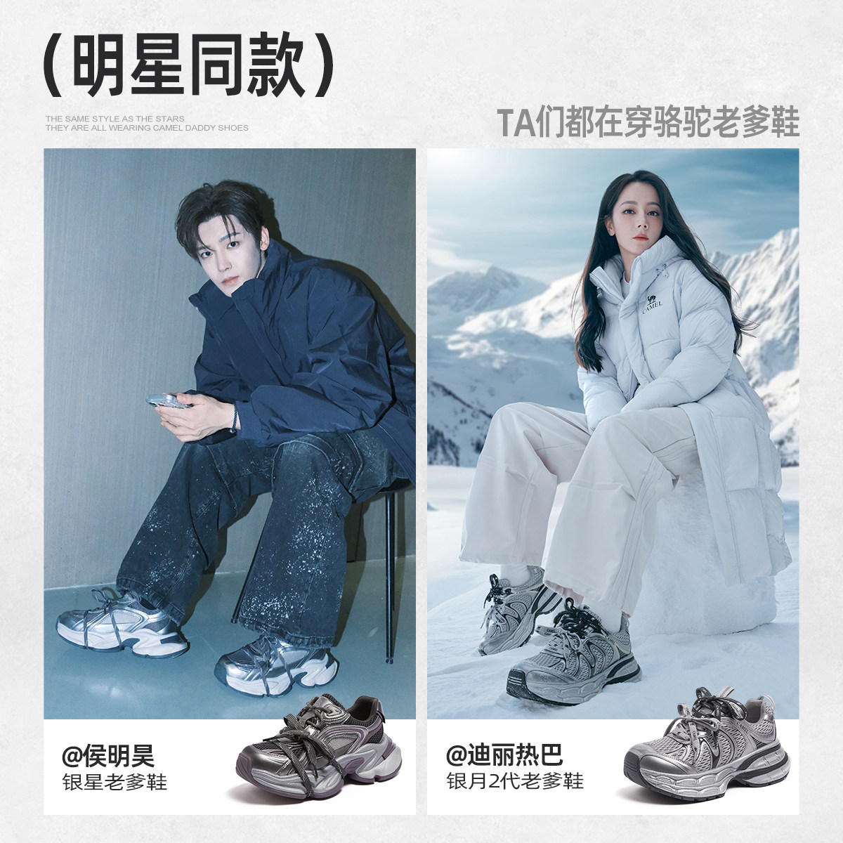 【迪丽热巴同款】骆驼银星厚底老爹鞋2026春加绒新款增高银色男女