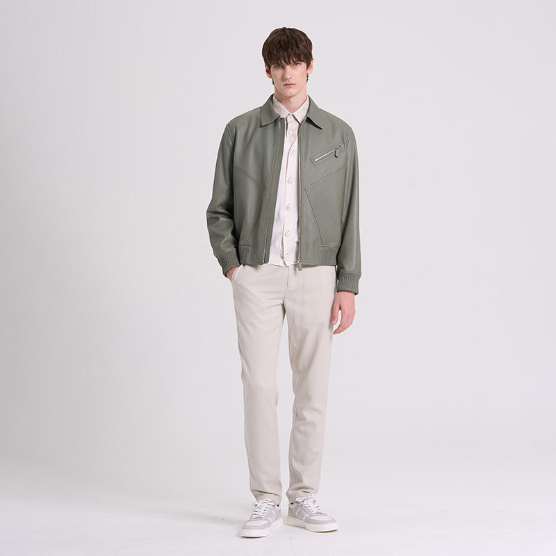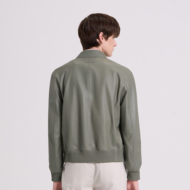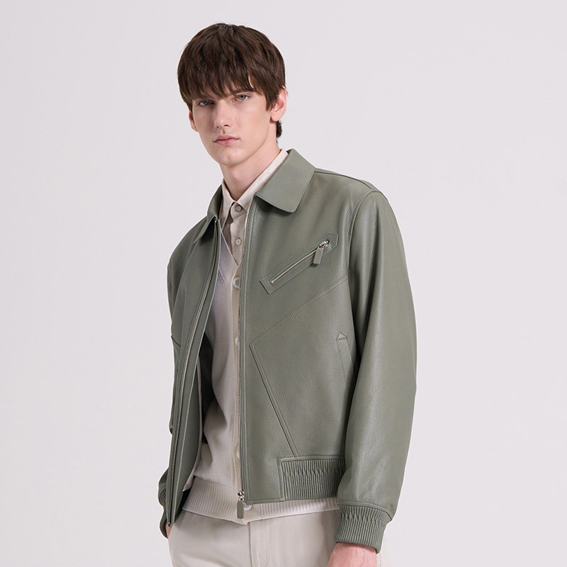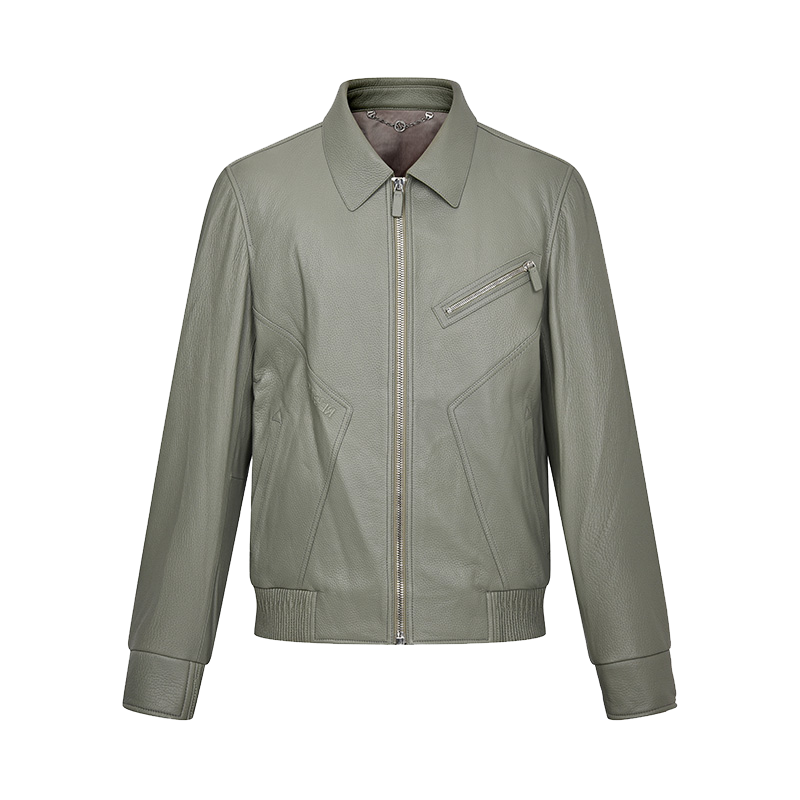 RARE威雅男装 男士夹克外套 秋冬新款灰绿色时尚翻领皮衣
