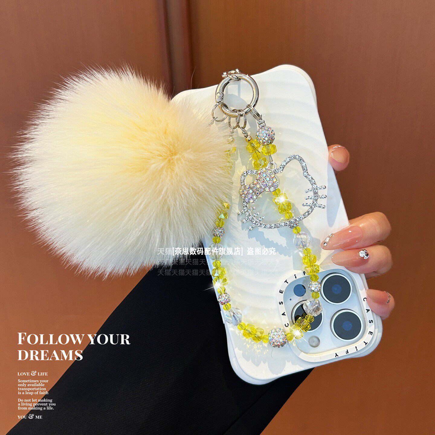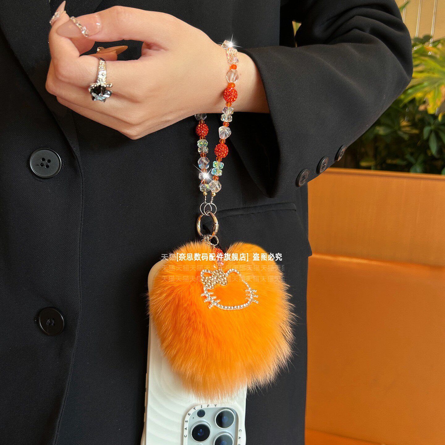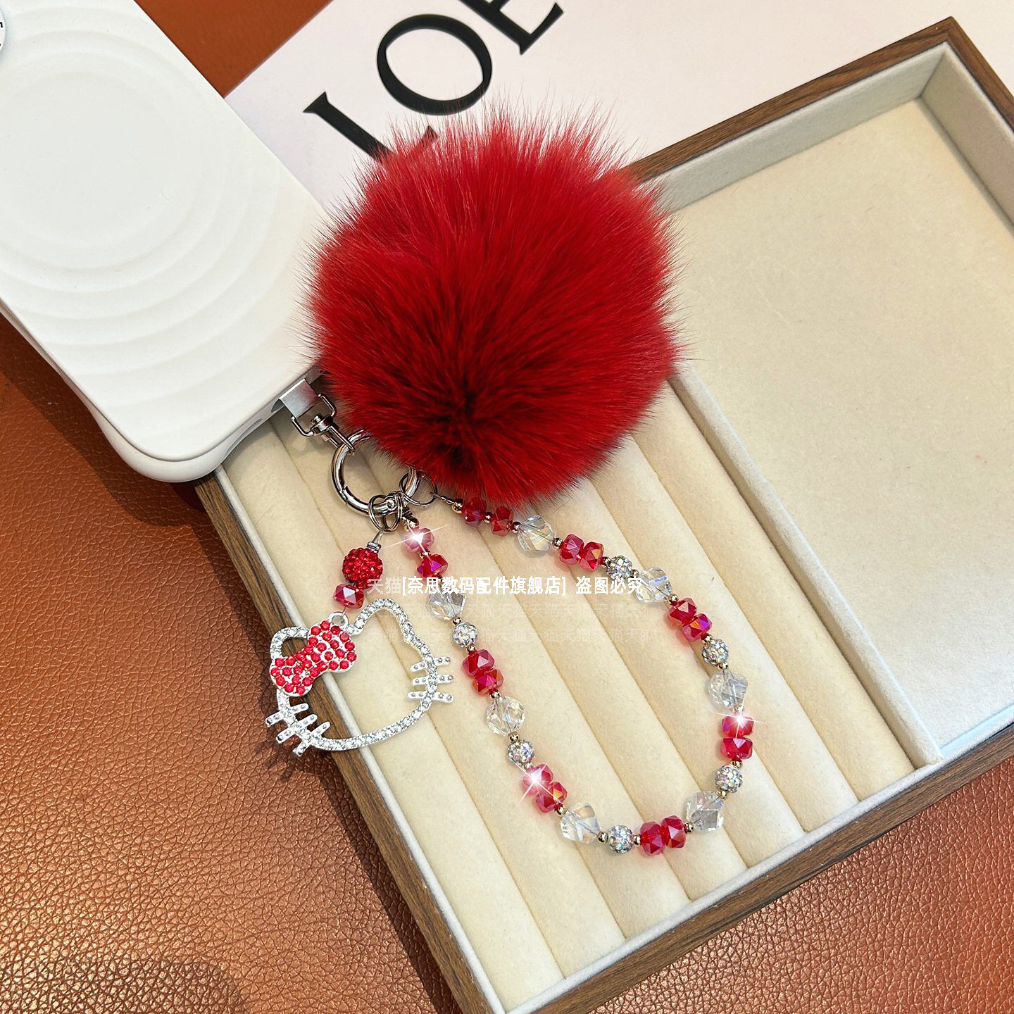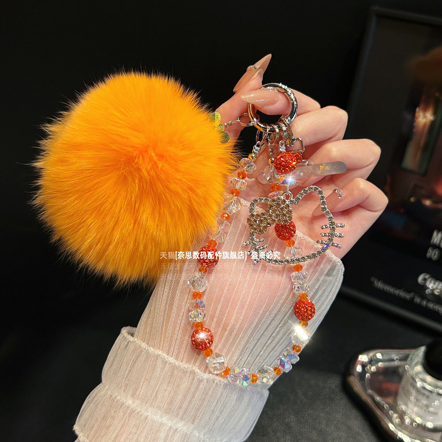 巨好看水晶手机链可爱水钻猫咪吊坠毛绒绒大毛球包包挂饰挂链爆闪精致串珠手腕链条轻奢漂亮高级感手链钥匙壳