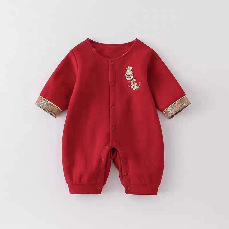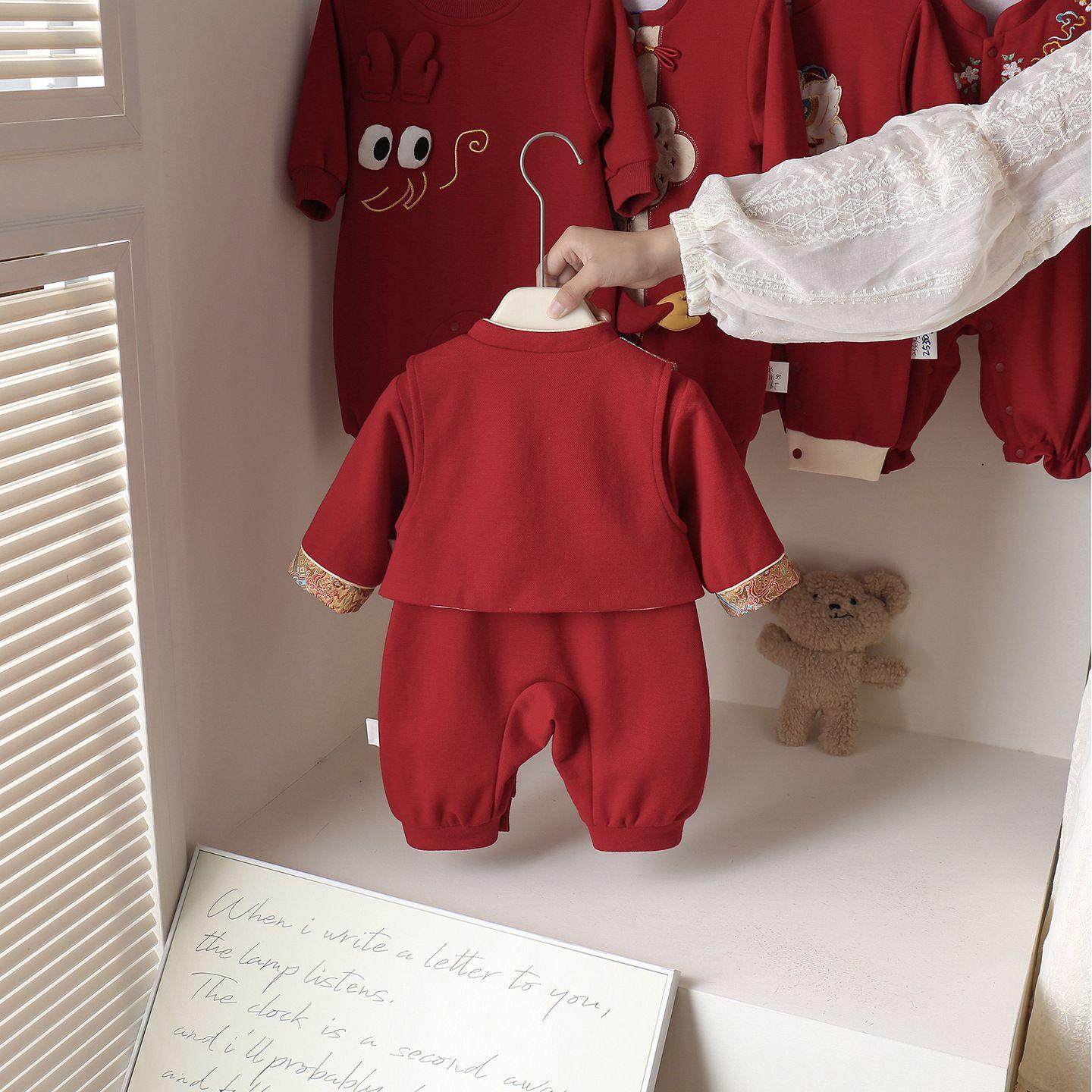 婴儿秋冬季马甲连体衣服宝宝满月红色喜庆国风哈衣过年礼服爬服