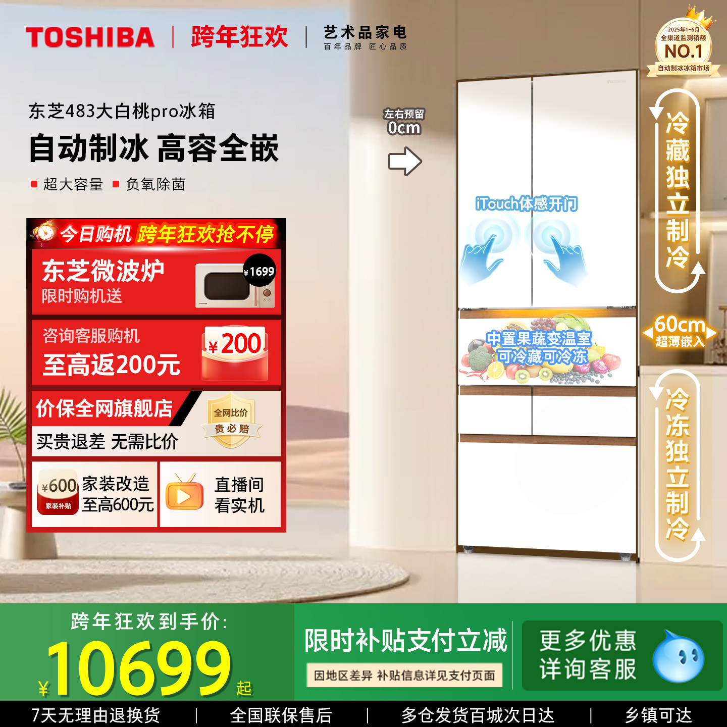 东芝大白桃Pro483超薄零嵌入双系统小户型大容量制冰家用多门冰箱