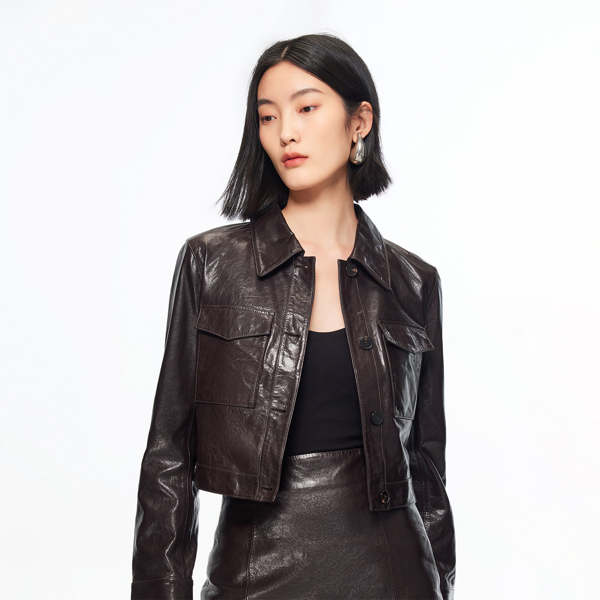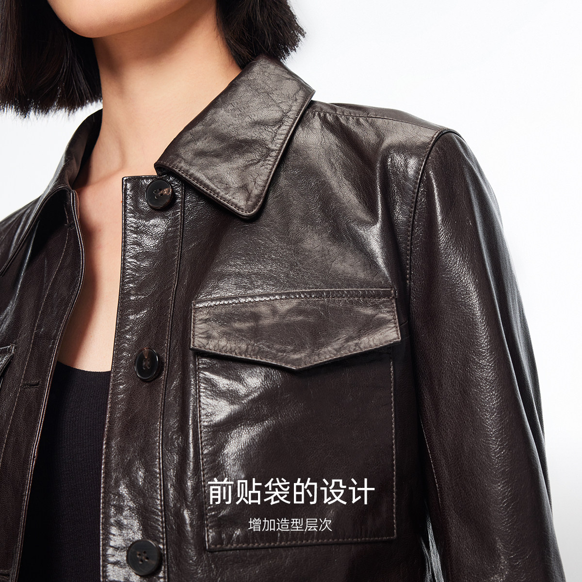 Vero Moda皮衣女2026春季新款羊皮革前贴袋翻领短外套326110004