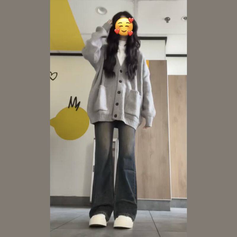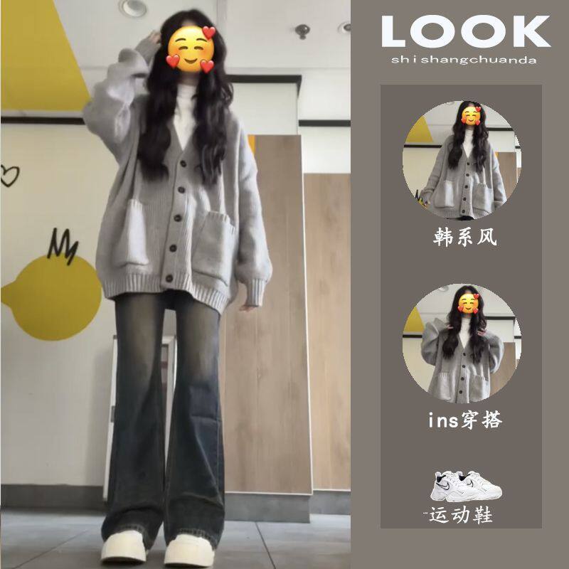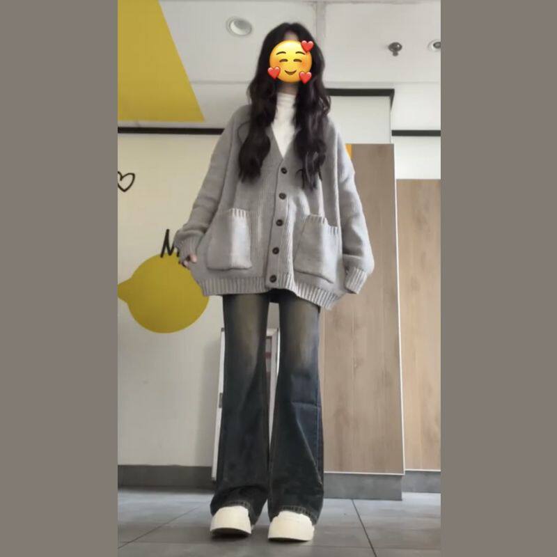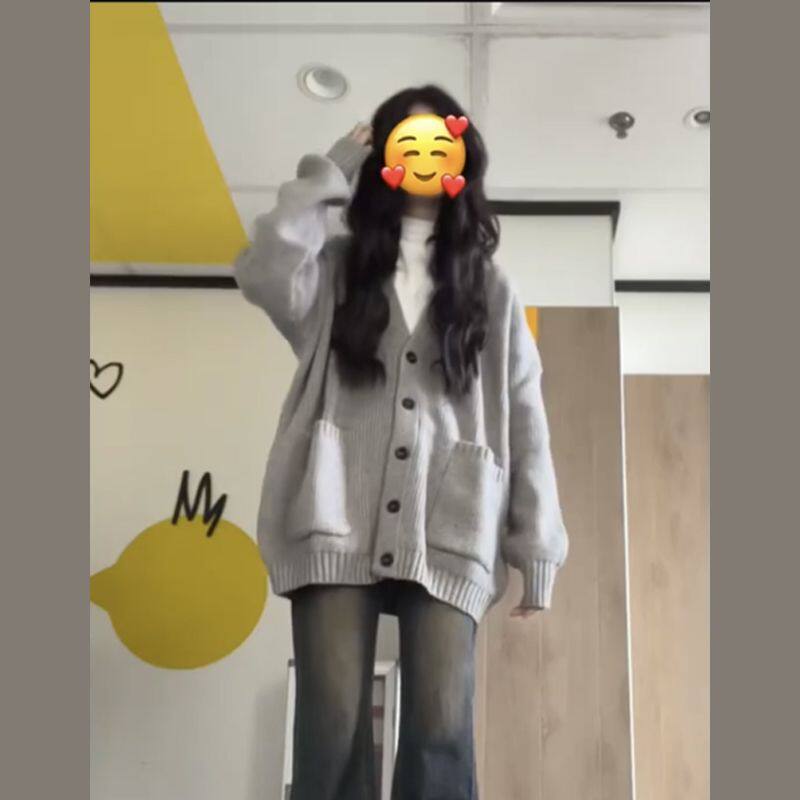 慵懒风软糯毛衣女装秋冬日系复古针织外套灰色大码内搭开衫上衣