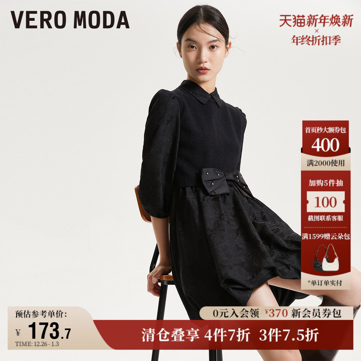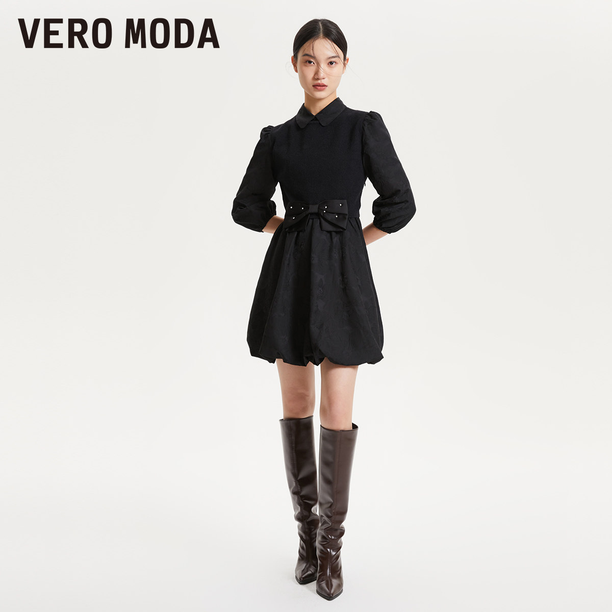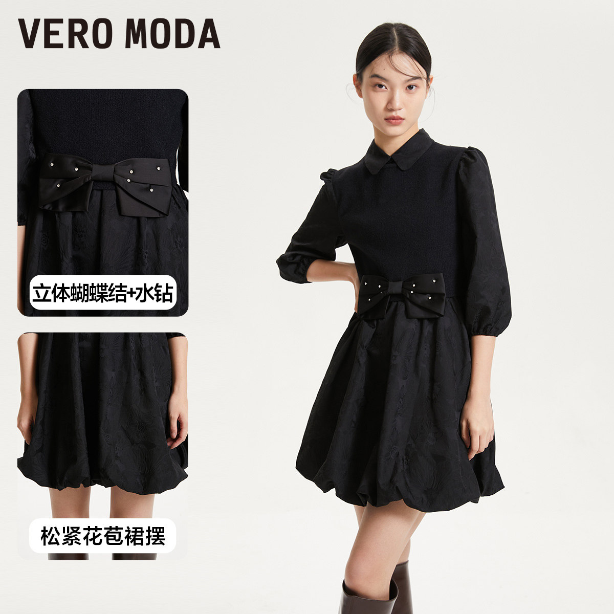 Vero Moda奥莱连衣裙子秋冬清仓假两件拼接针织蝴蝶结水钻短裙女