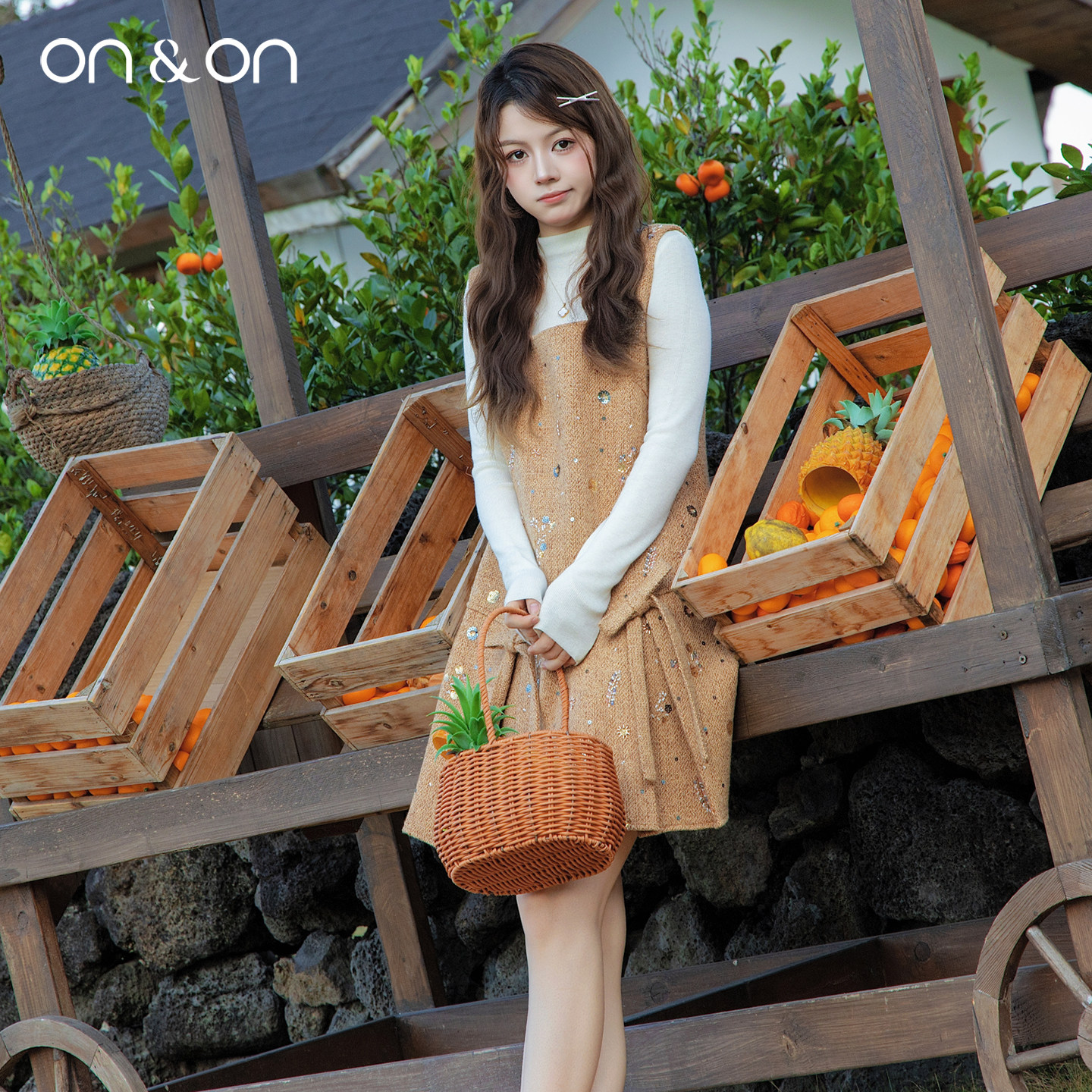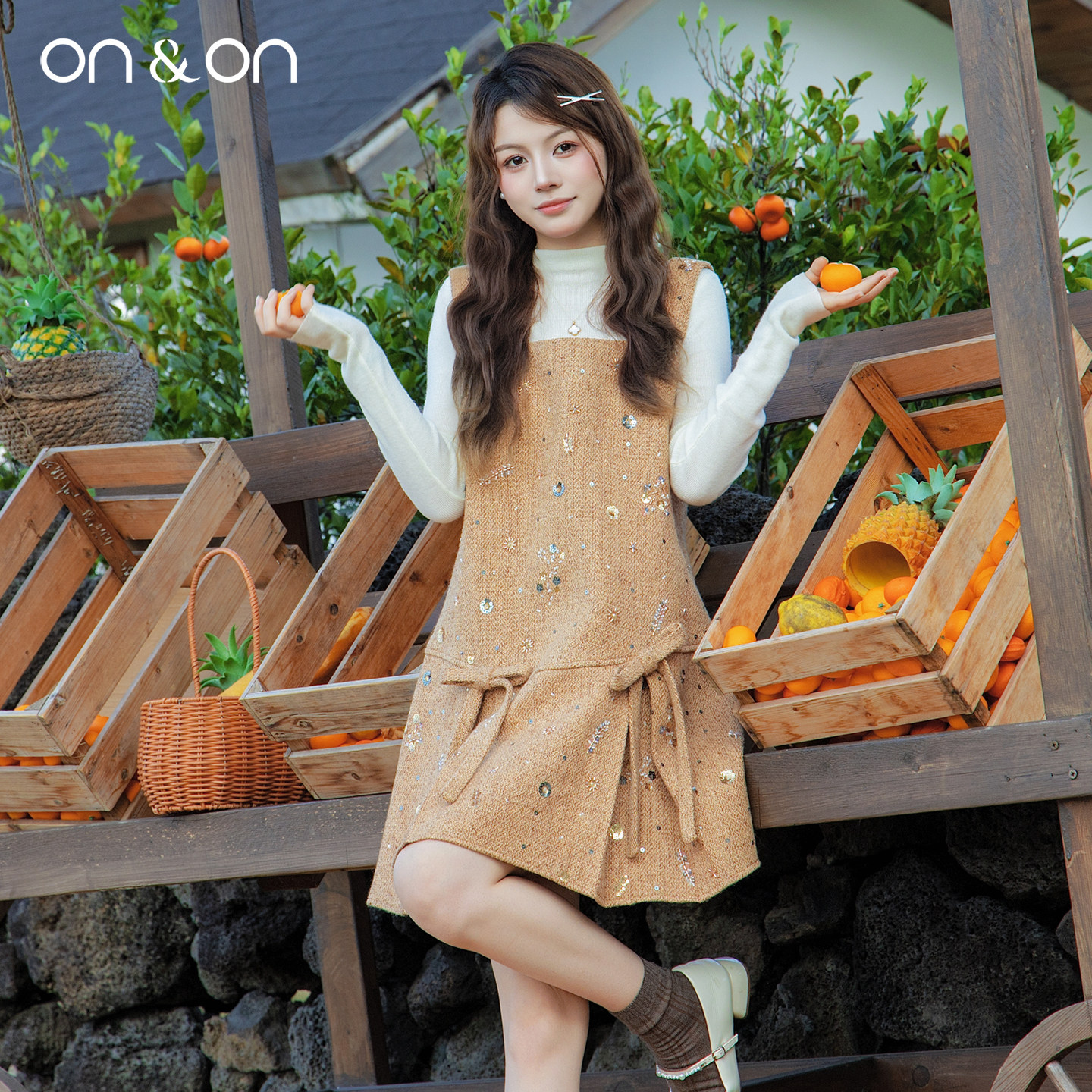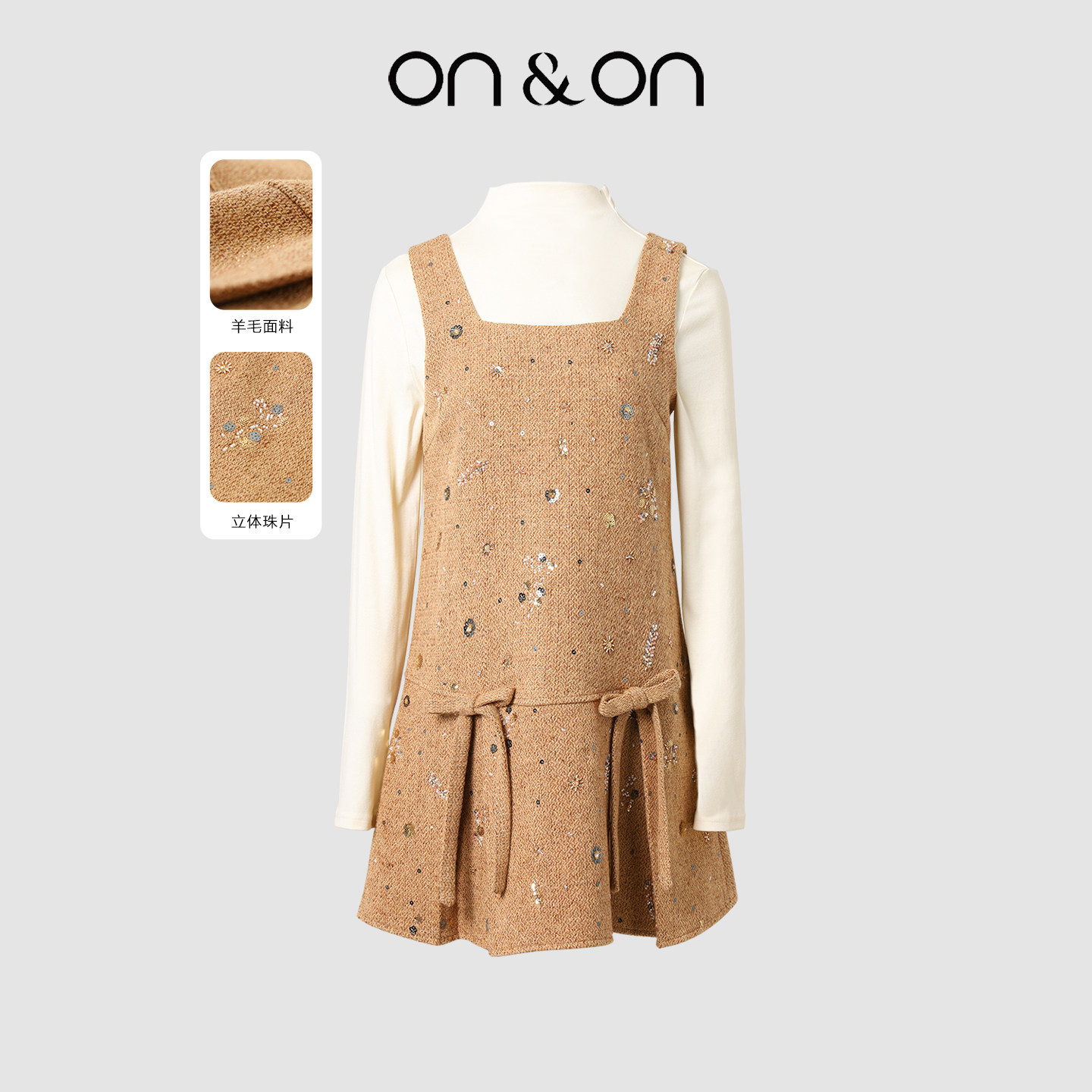 ON&ON/安乃安2025冬季新款韩系减龄钉珠吊带裙+高领针织衫套装