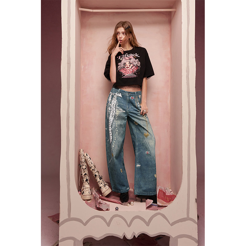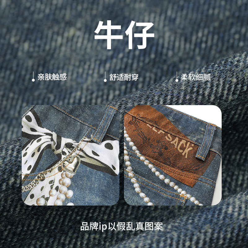 自然涩美式小熊牛仔裤女春秋新款韩系小众设计感阔腿裤子冬季加绒