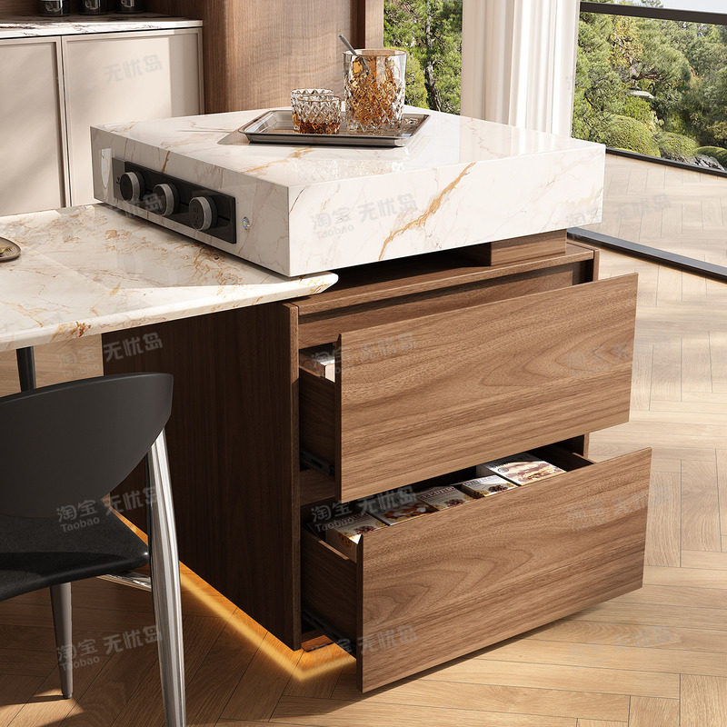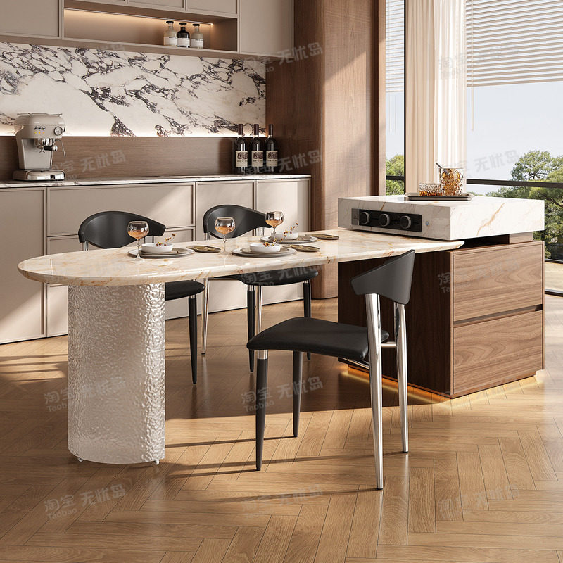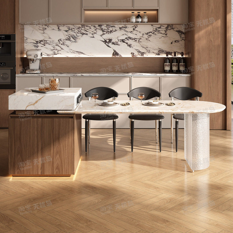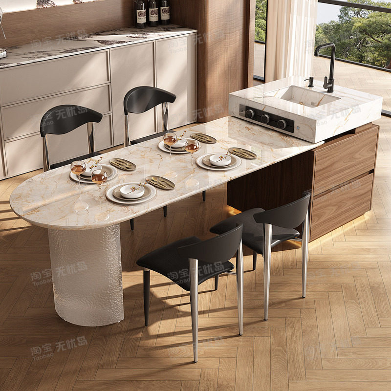 天然奢石岛台餐桌一体宝格丽金中古风大理石别墅高级感客餐厅家用