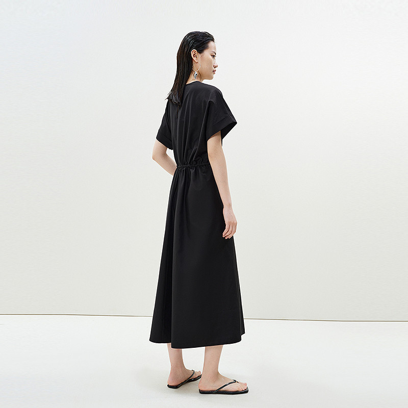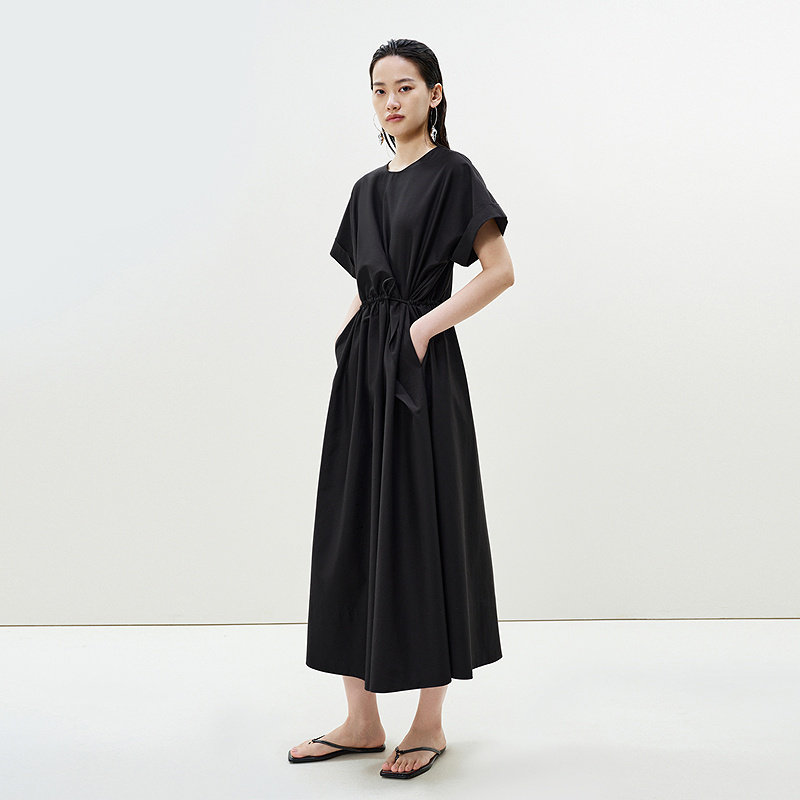 LESS夏圆领短袖连衣裙女黑色简约通勤收腰裙子含桑蚕丝2P5G12020