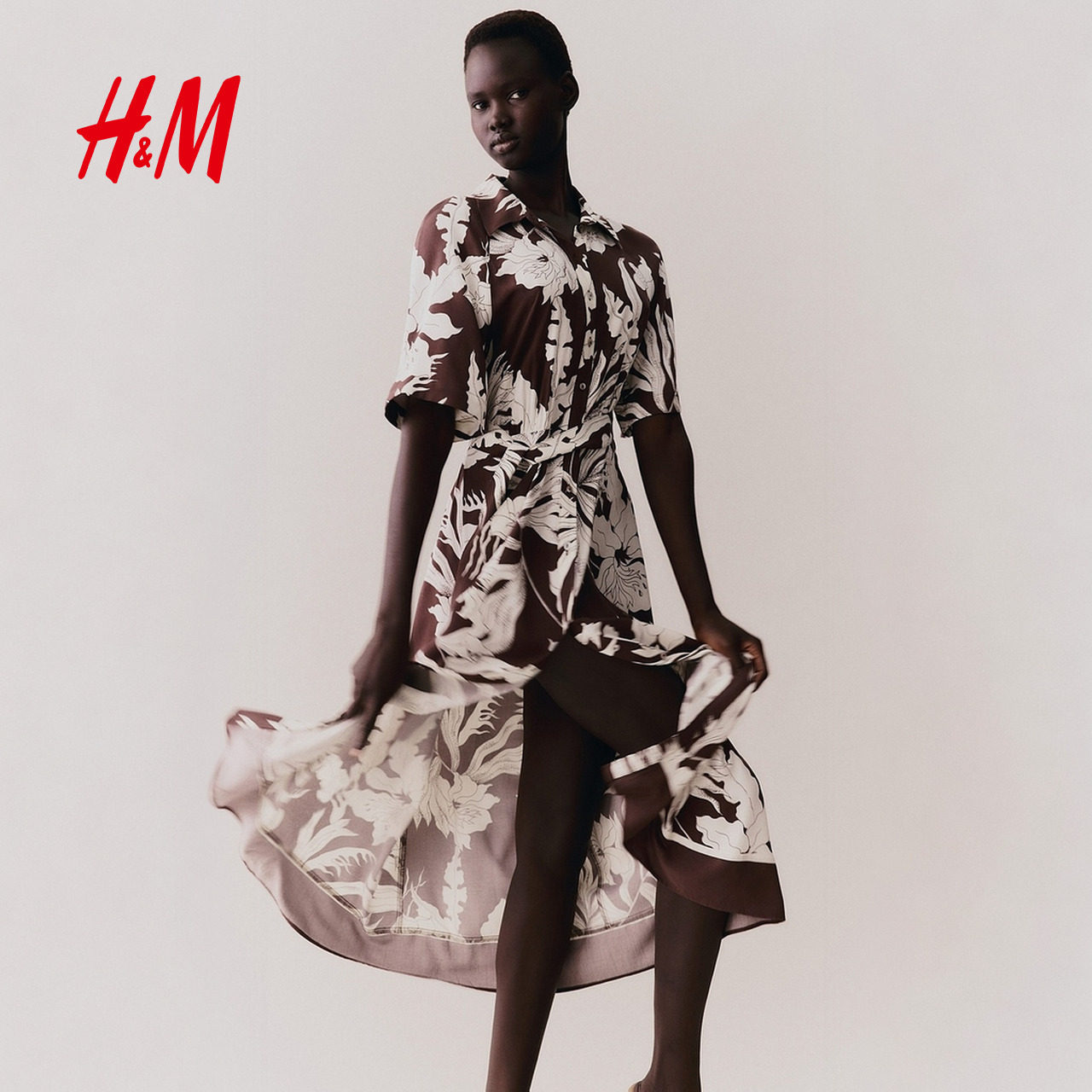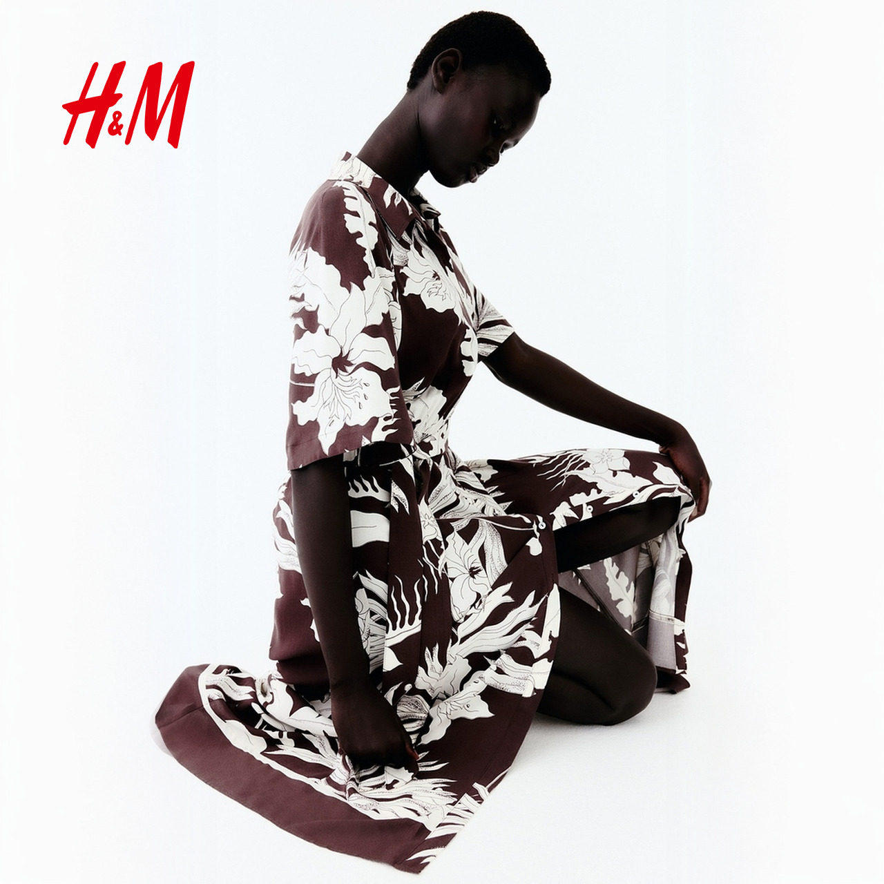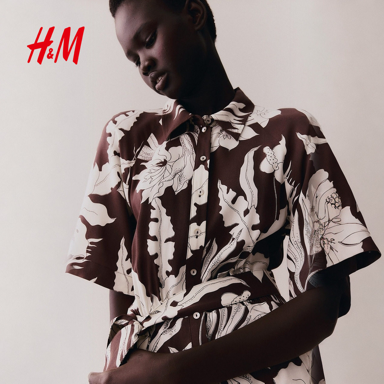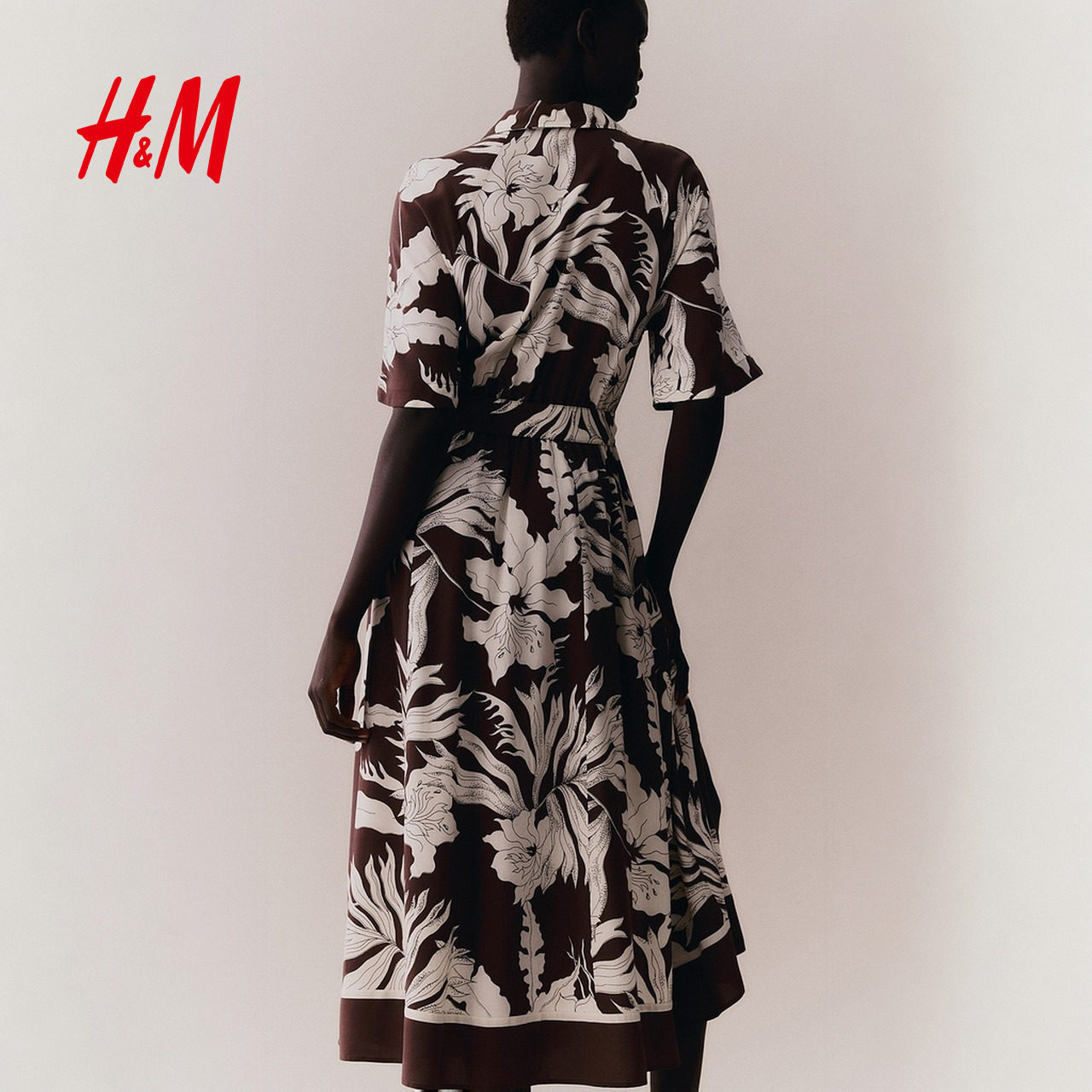 HM女装花卉连衣裙2025夏季新款腰部系带衬衫式印花中长裙1217576