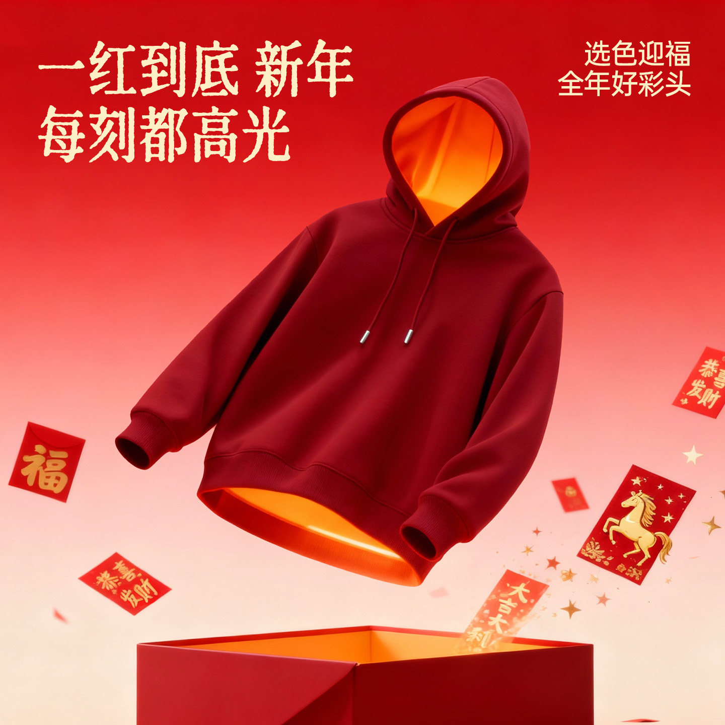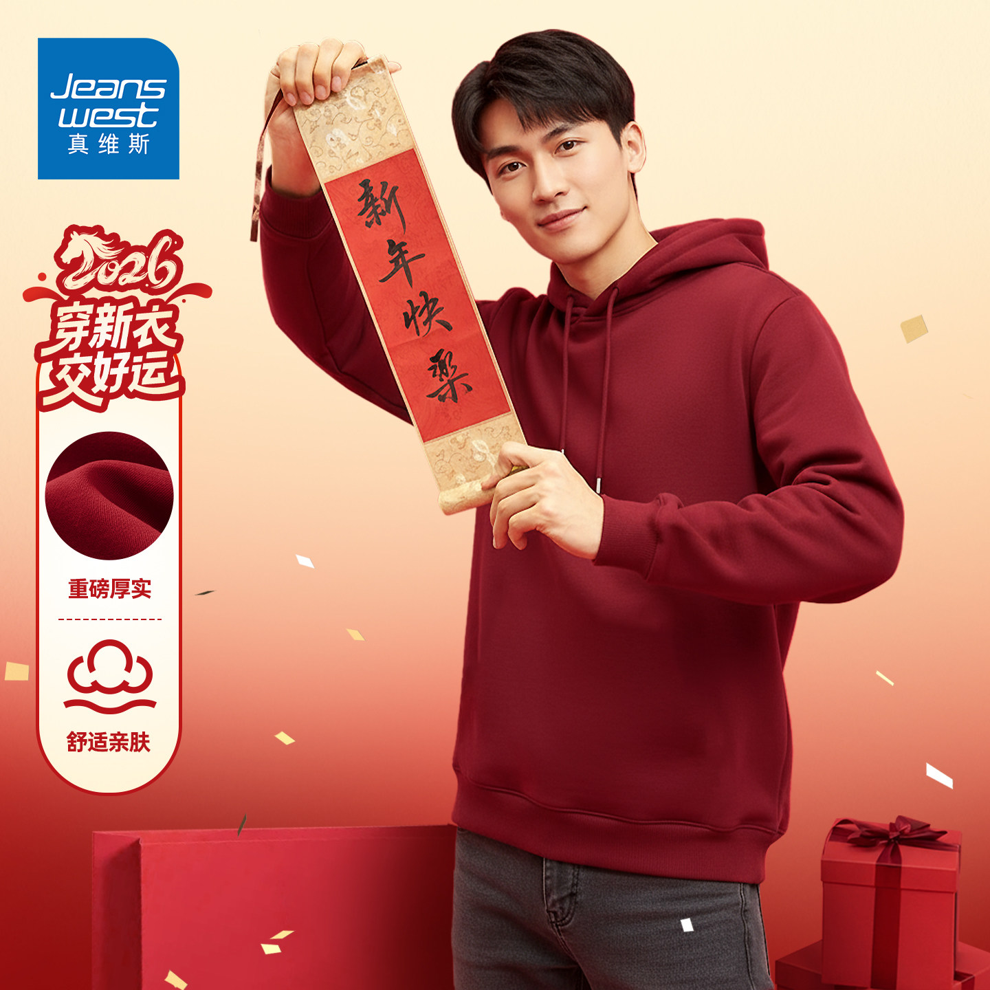 GV真维斯红色连帽卫衣男加绒2026马年本命年衣服男女同款情侣装C