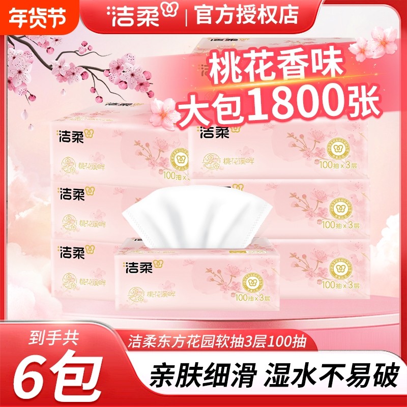 【桃花香6包】洁柔花香味抽纸3层100抽大包纸巾可湿水面巾纸家用