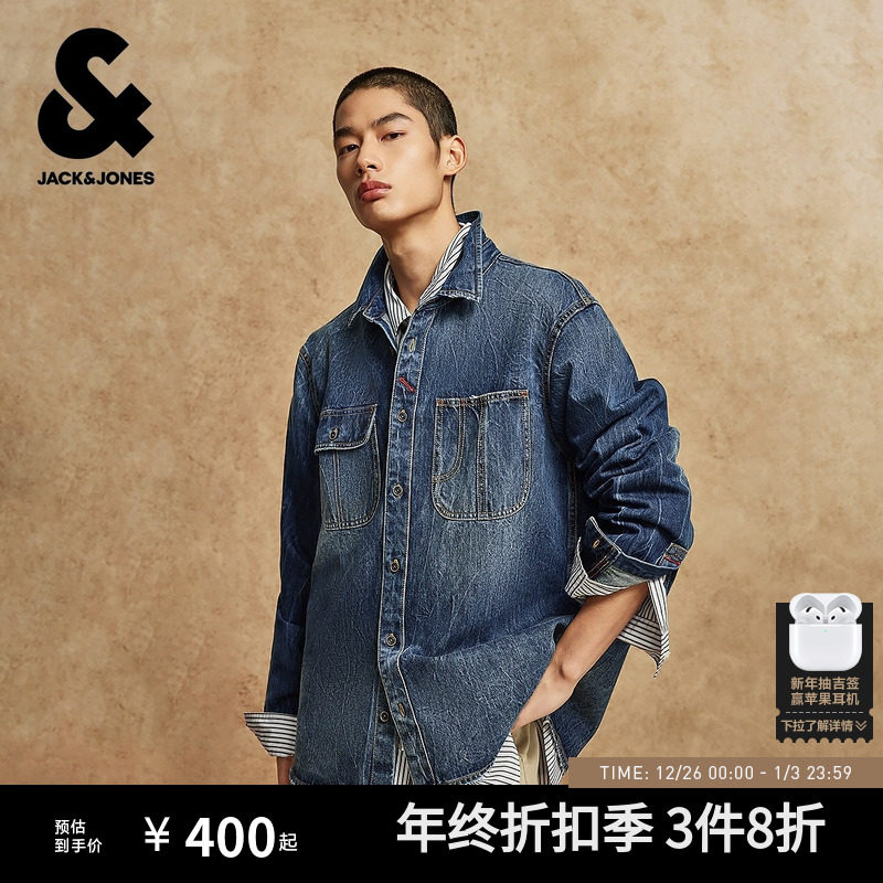 杰克琼斯男装秋季衬衫牛仔宽松翻领纯色磨毛做旧水洗纯棉百搭外套