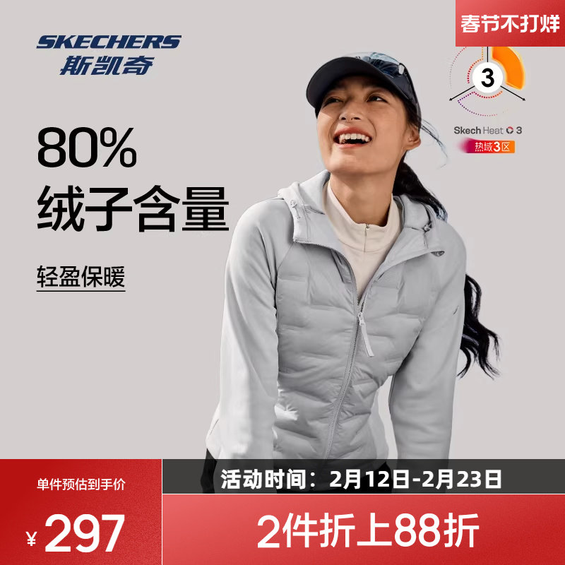 斯凯奇运动羽绒服冬季轻薄保暖柔软舒适梭织短款连帽外套百搭