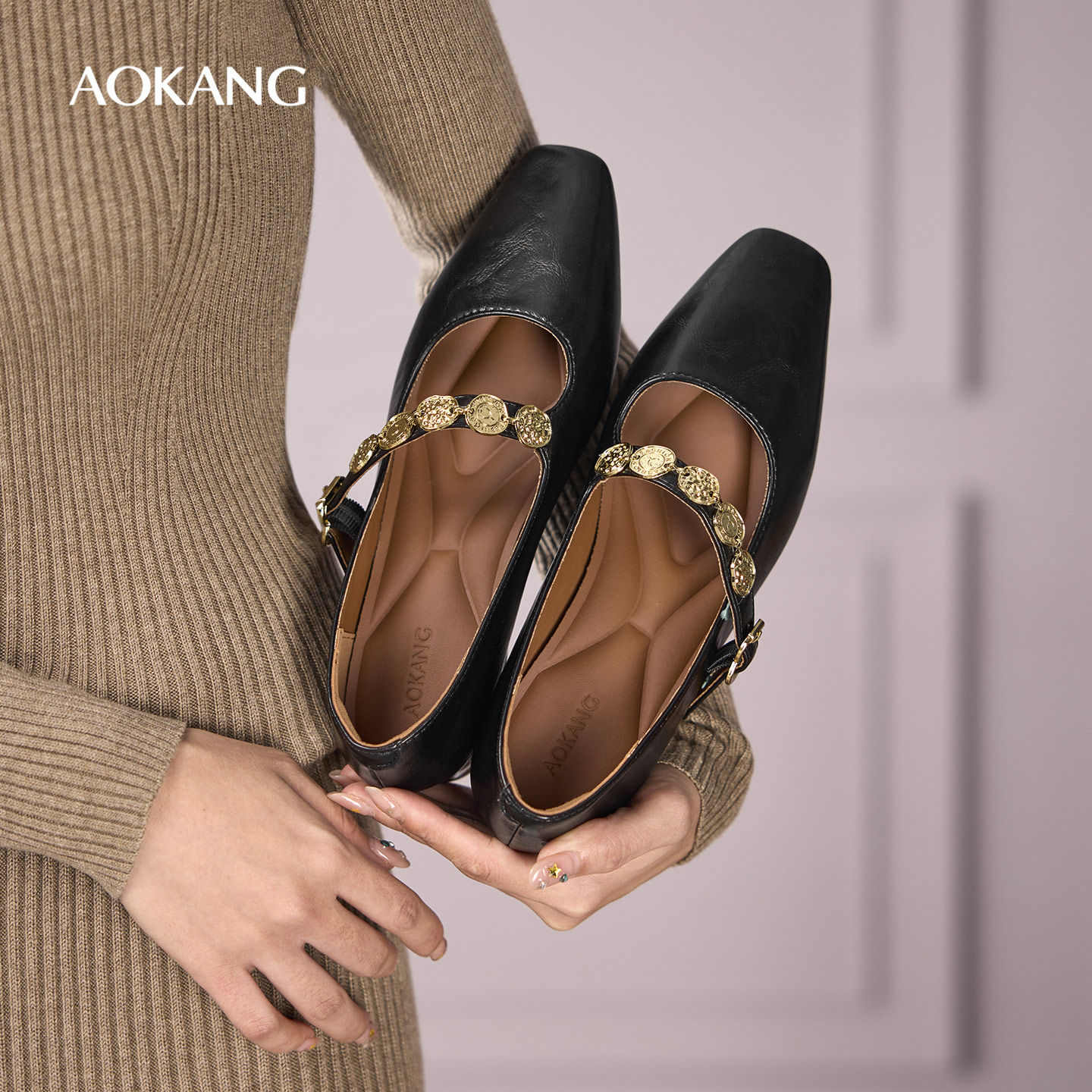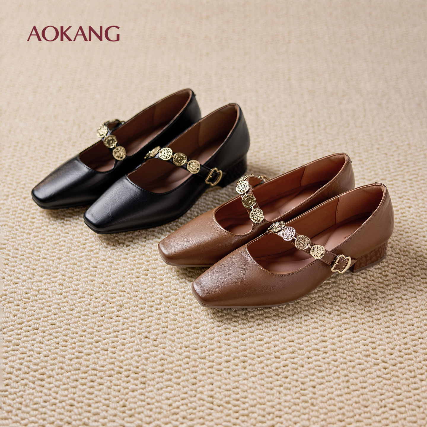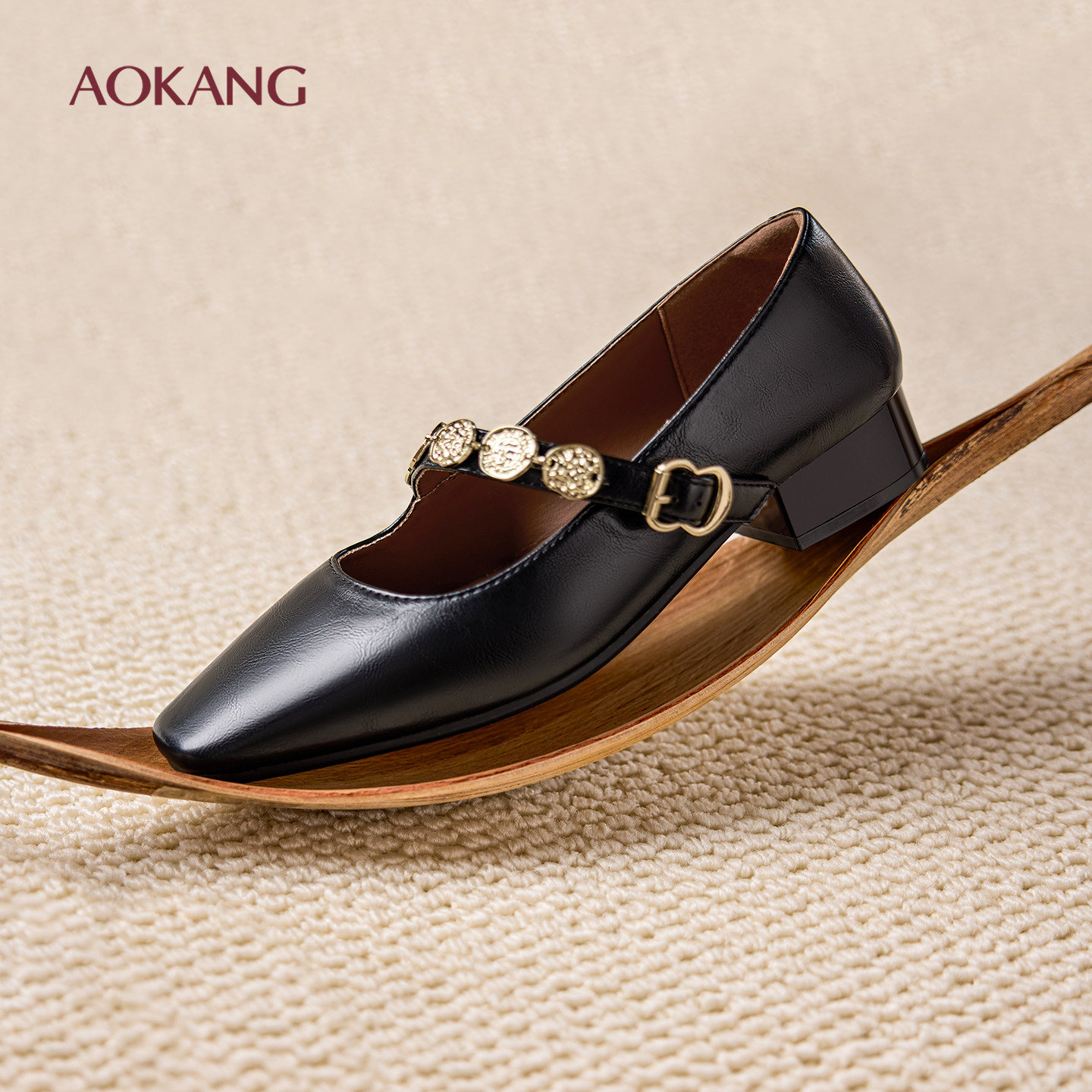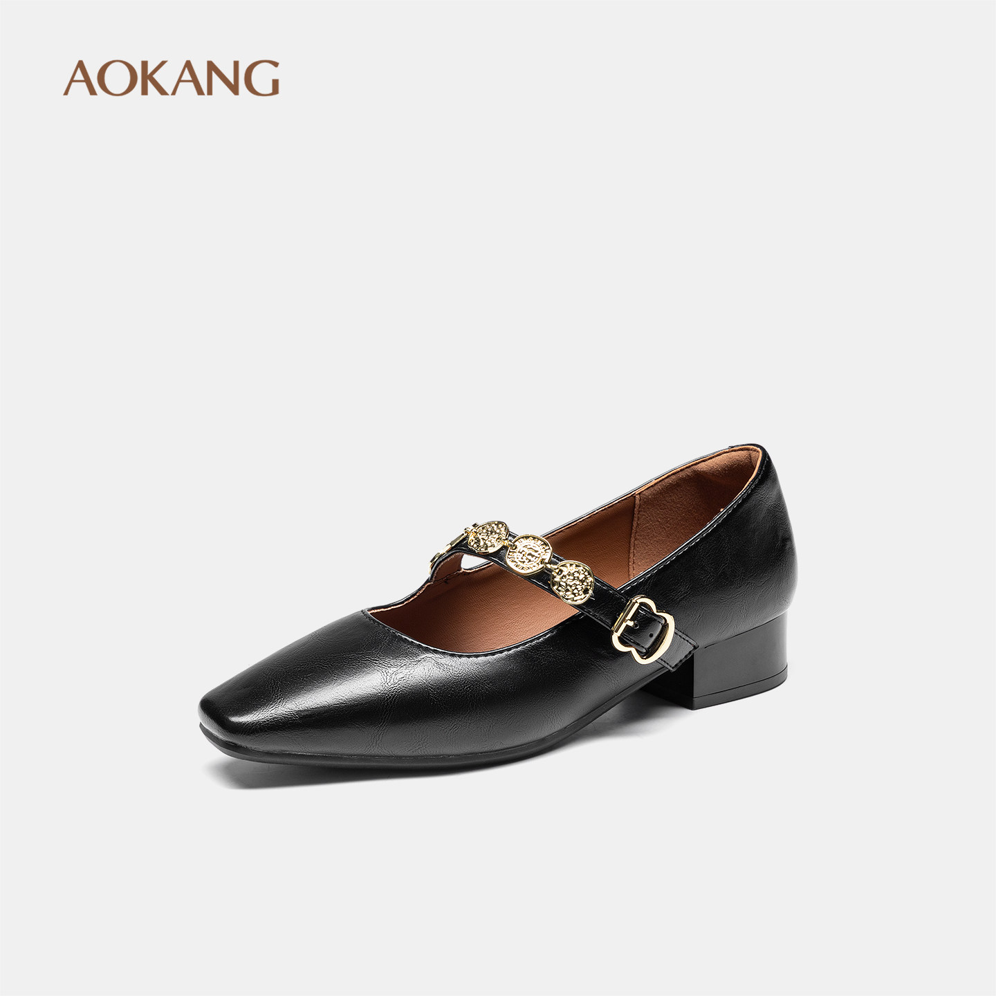 奥康 女鞋2025秋季新款法式复古单鞋女粗跟方头浅口玛丽珍黑色