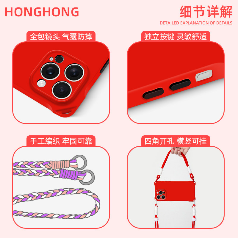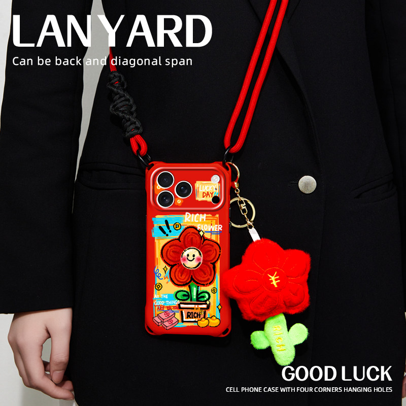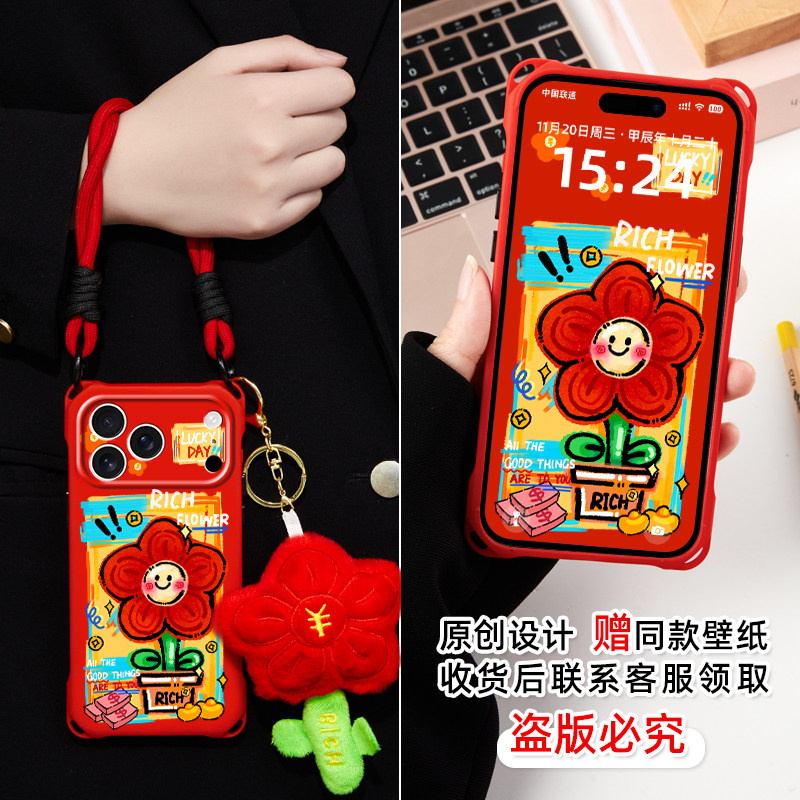 原创红花适用iphone17promax挂脖手机壳新款斜跨华为pura70ultra卡通挂件mate70小众新年苹果15带挂绳16plus