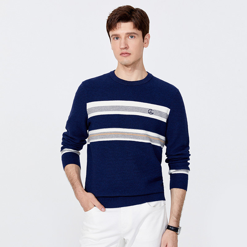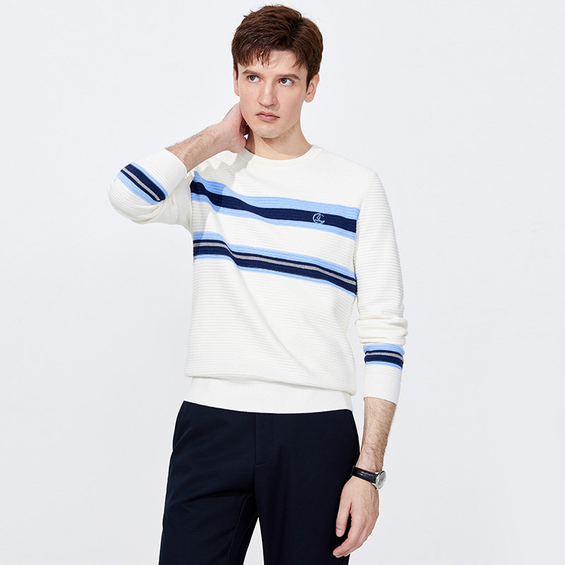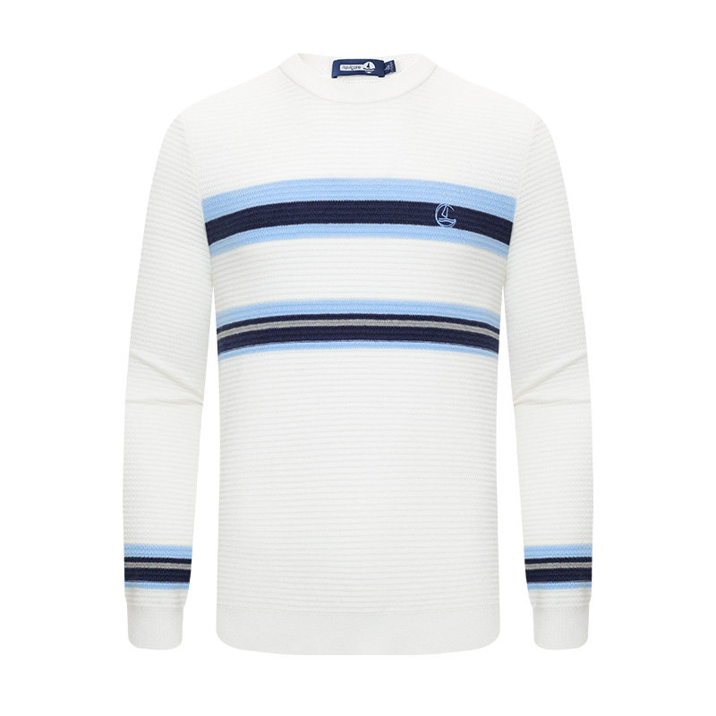 【羊绒】Navigare意大利小帆船冬季条纹白色毛衣男圆领打底针织衫