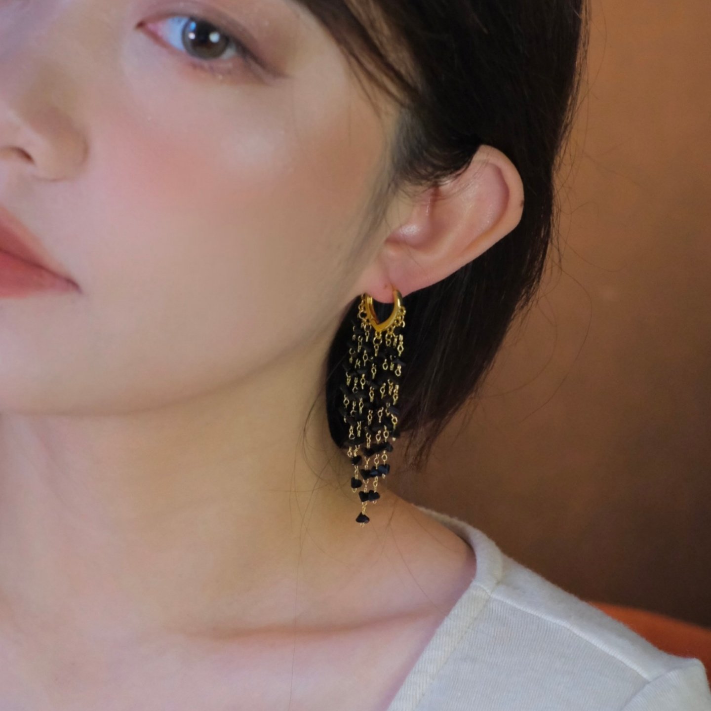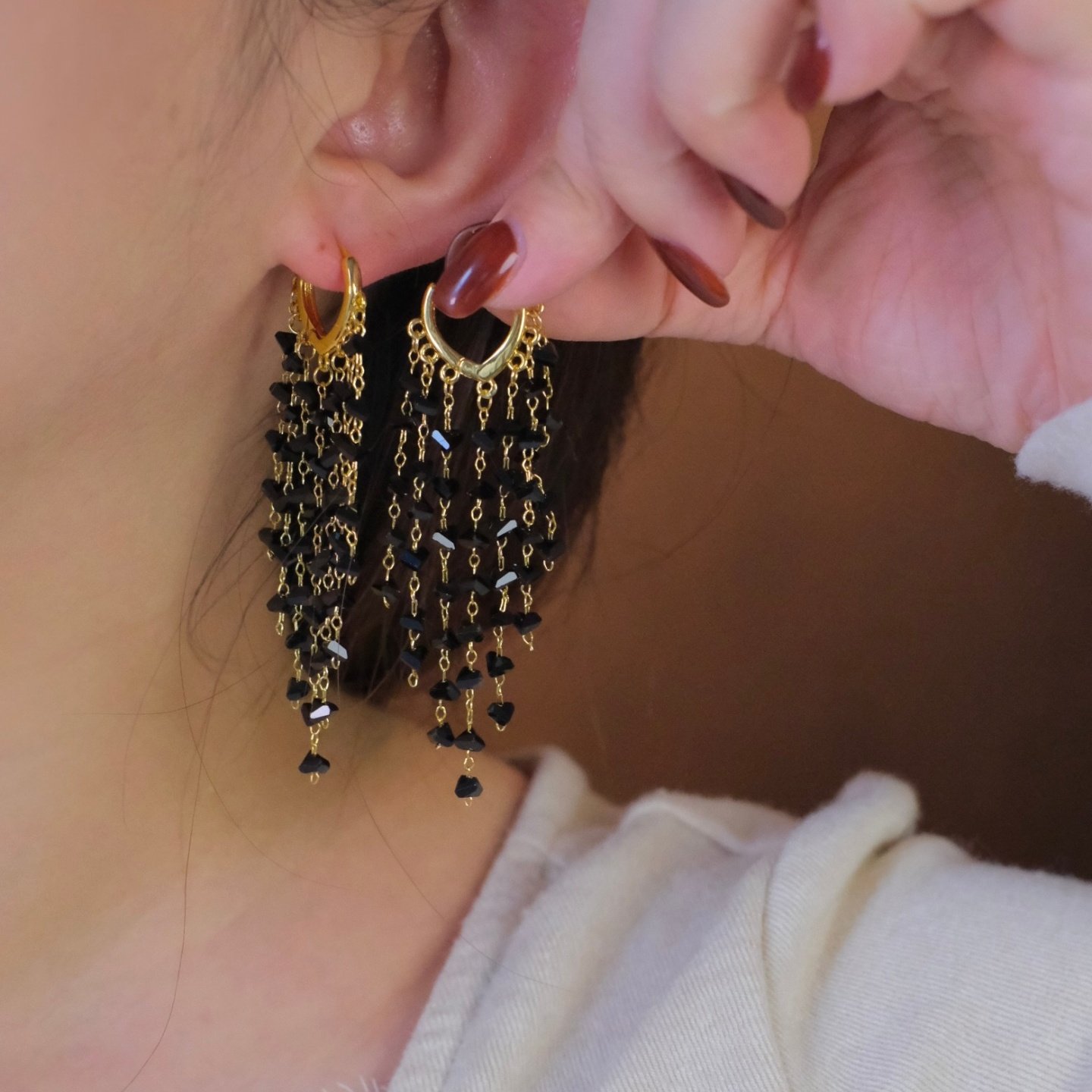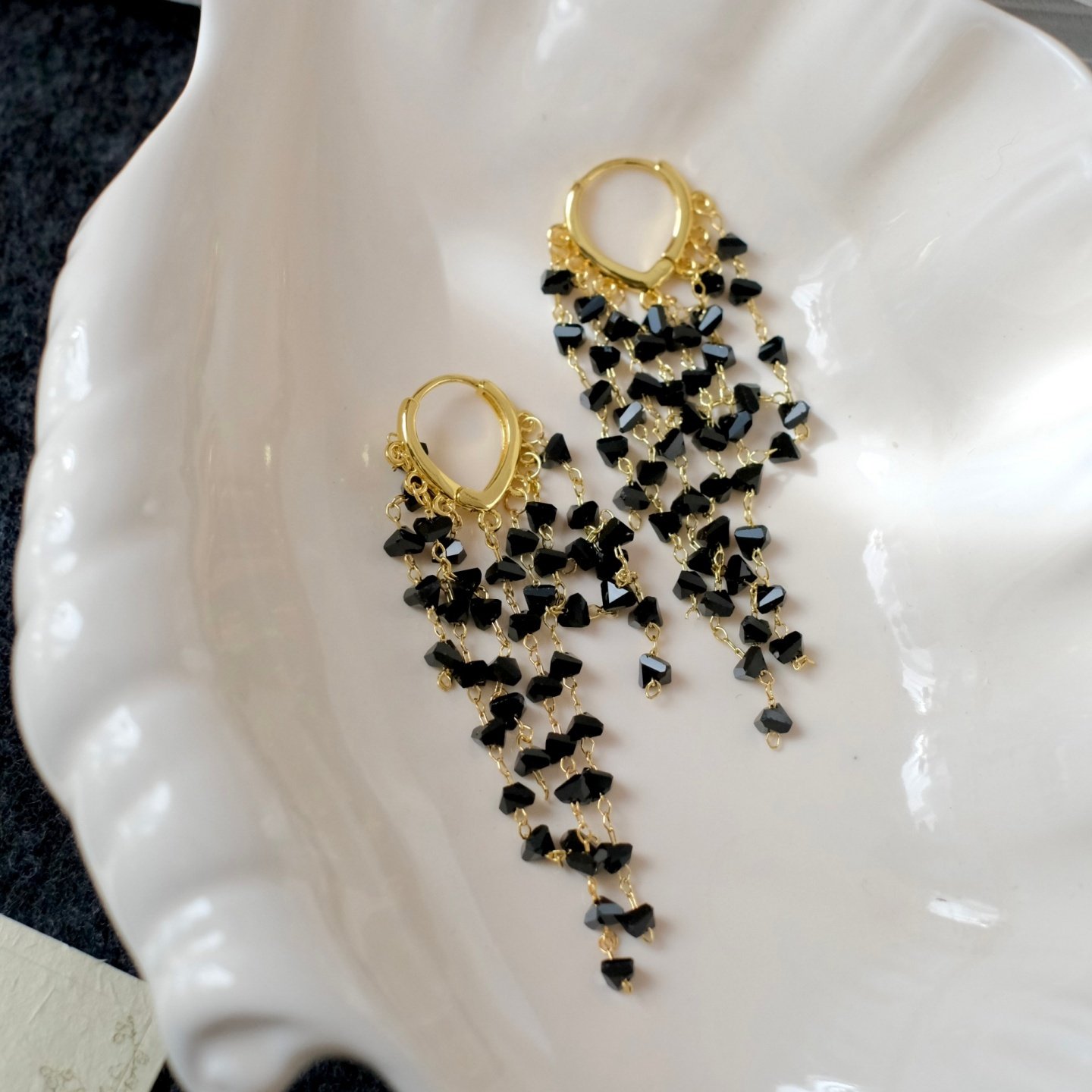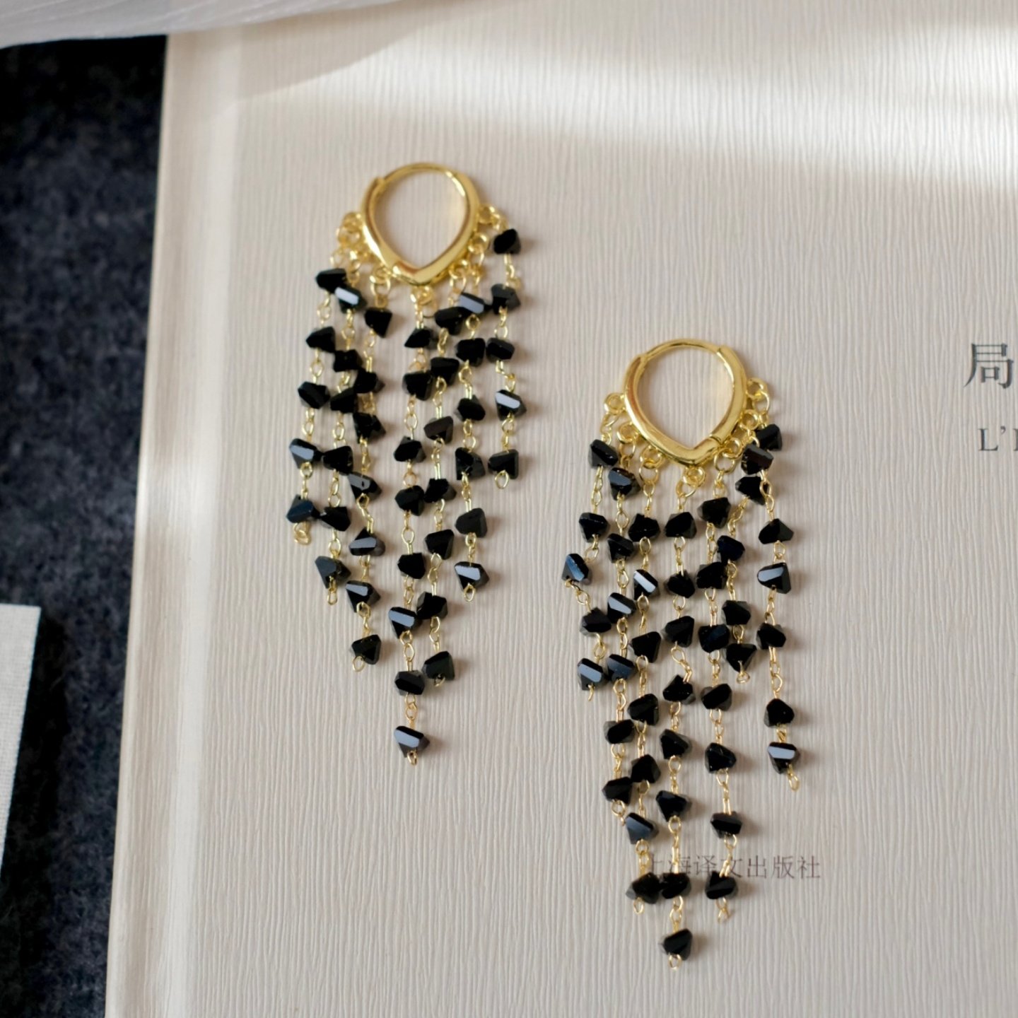 《墨金夜宴》复古优雅宫廷风黑色水晶长流苏精致耳饰耳夹耳环耳扣
