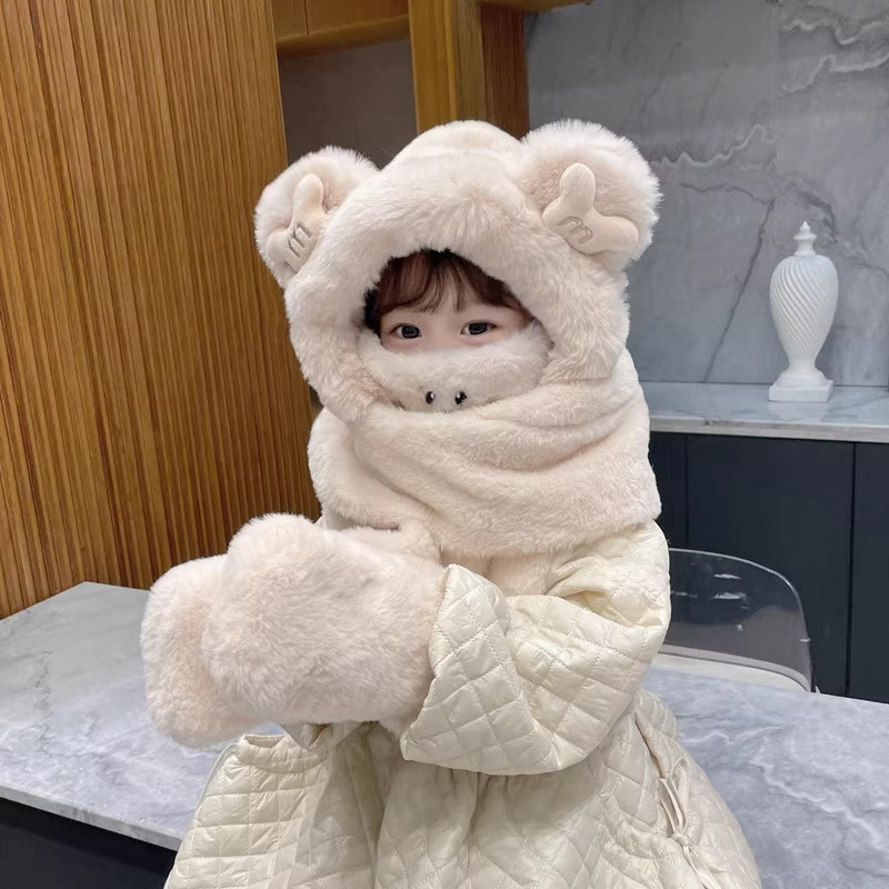 儿童帽子冬季保暖女童毛绒帽围巾一体帽新款口罩手套男宝宝帽洋气