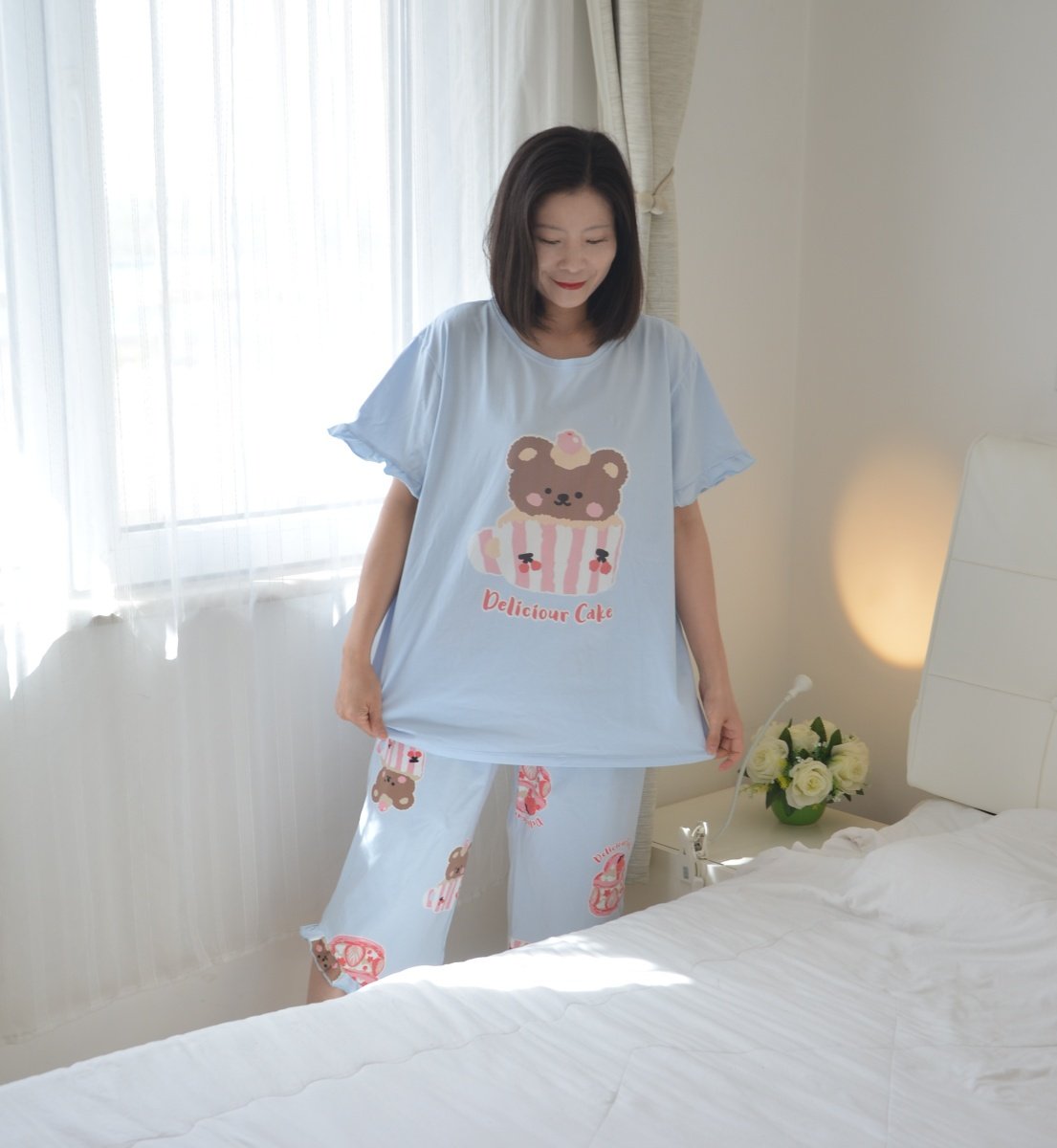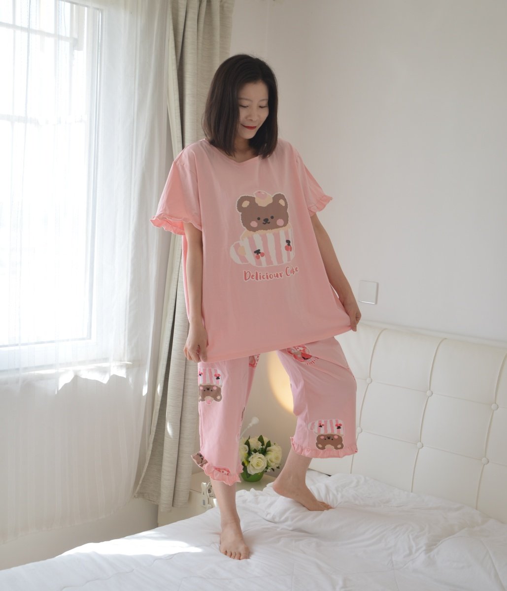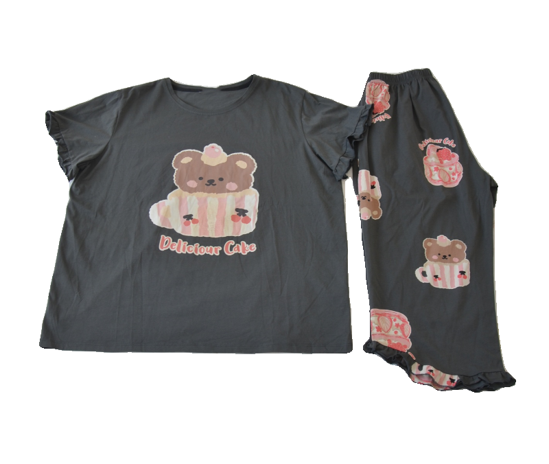 蛋糕熊睡衣女夏季短袖七分裤纯棉加肥加大码胖MM200斤家居服套装