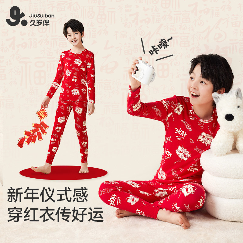 久岁伴儿童秋衣秋裤男童秋冬新品透气祥狮新年红色保暖内衣套装