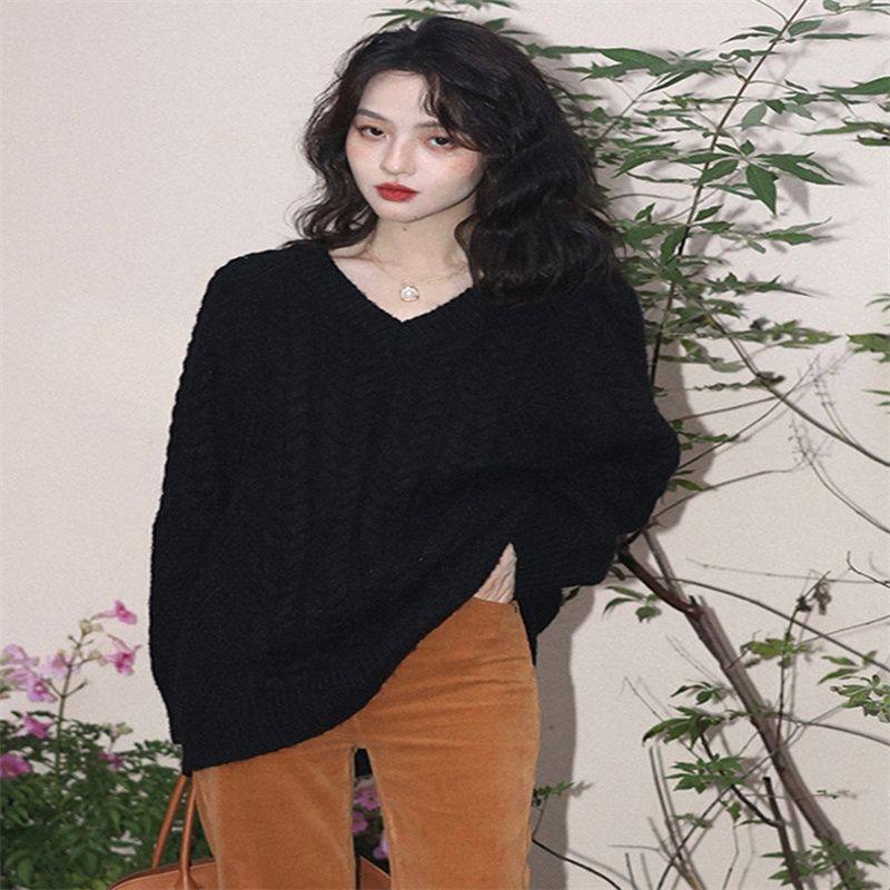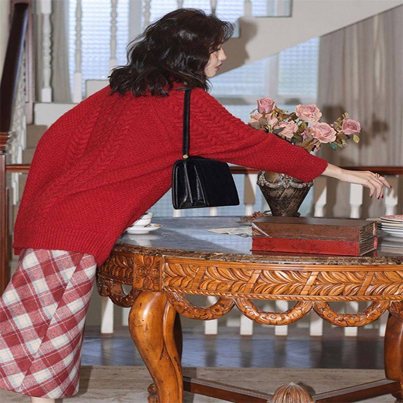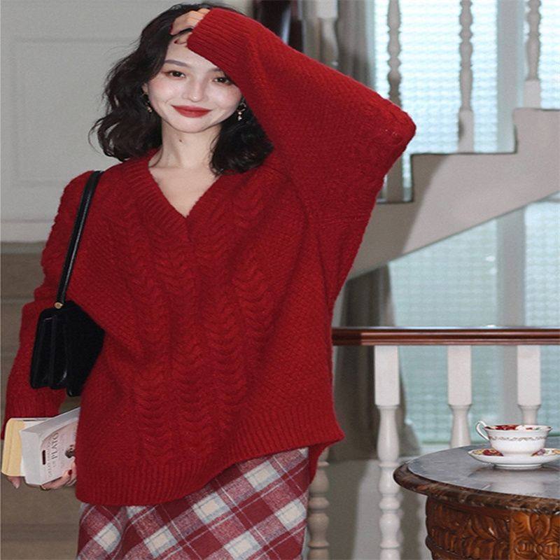 酒午港风复古V领麻花红色毛衣大码内搭显瘦长袖针织上衣女冬季