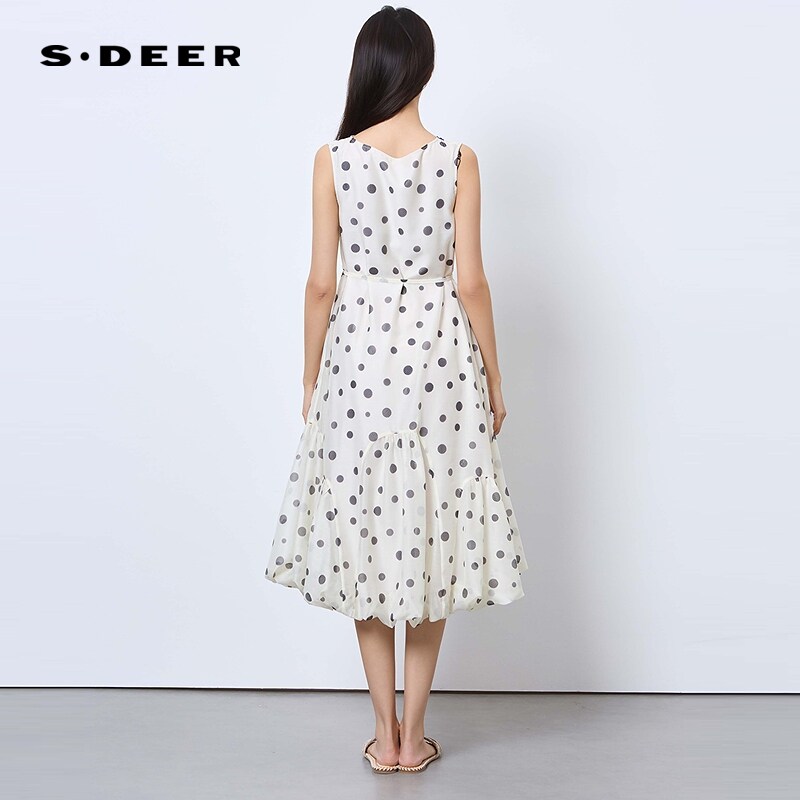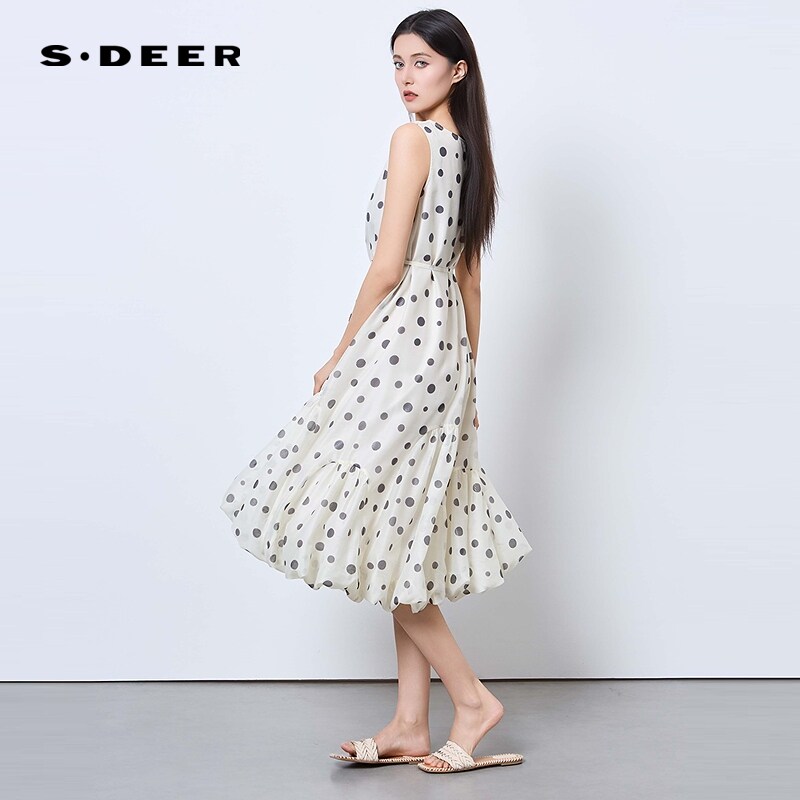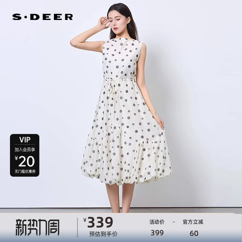 sdeer圣迪奥女装25年新品复古圆领波点收腰无袖连衣裙S252Z1291
