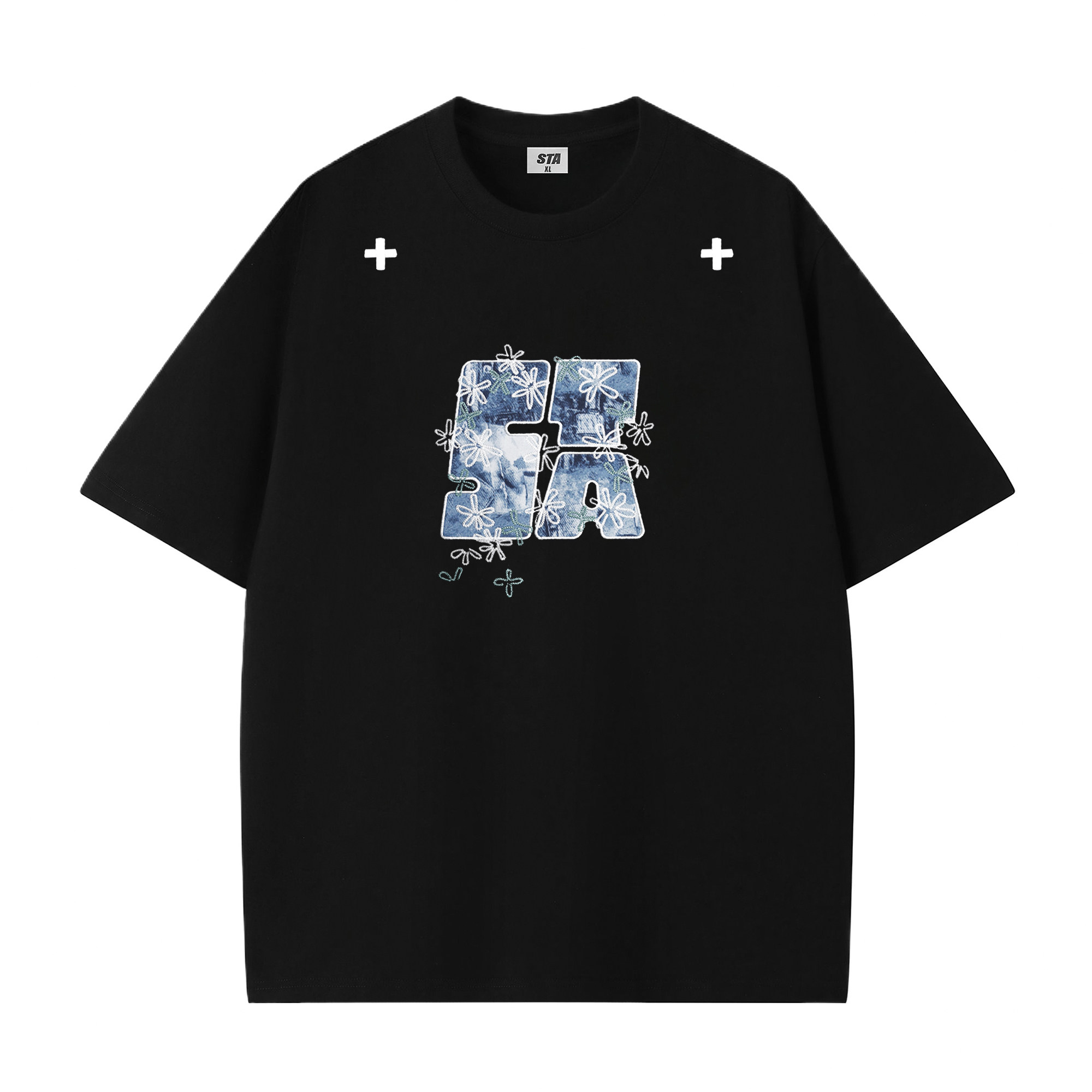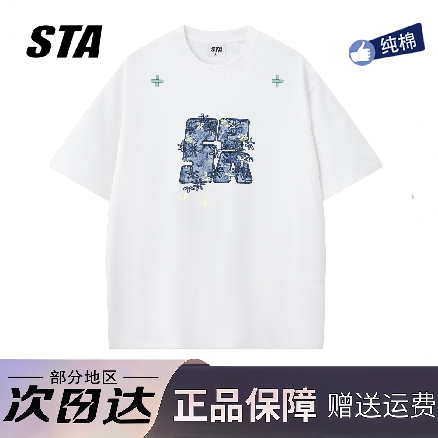 STA旗舰店刺绣牛仔贴布短袖男女夏季美式潮牌复古高街重磅纯棉T恤