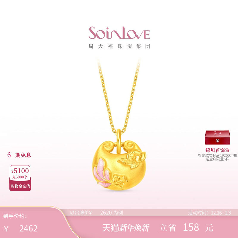 周大福SOINLOVE 十里红妆锦鲤戏莲胖福福袋黄金吊坠生日礼物