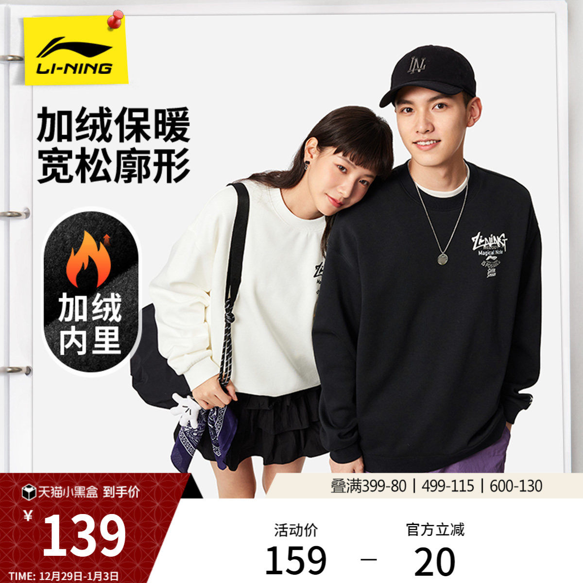 李宁加绒卫衣男士冬季官方新款情侣上衣套头保暖长袖加厚女运动服