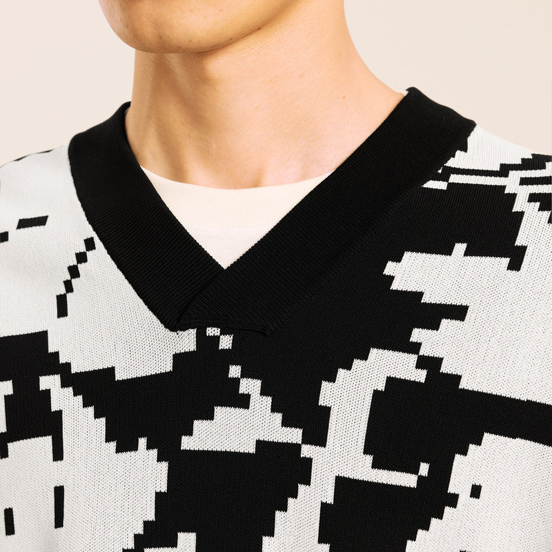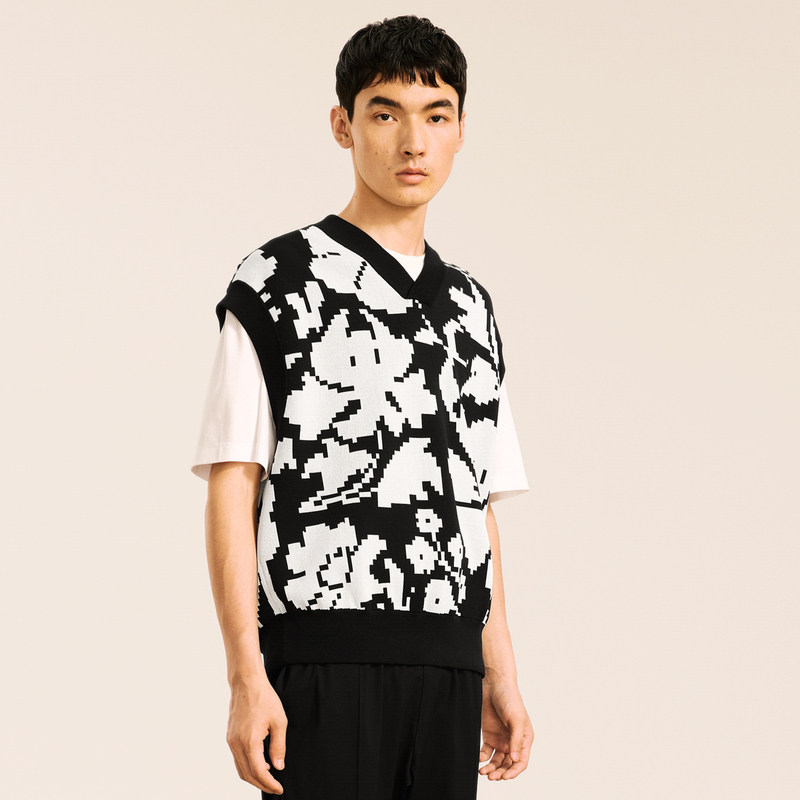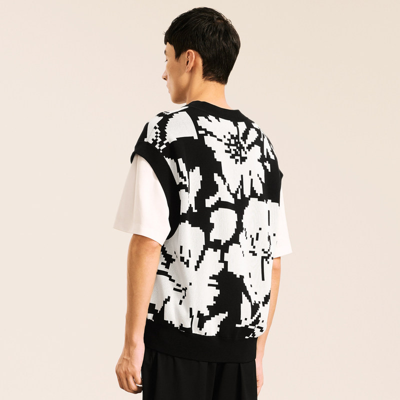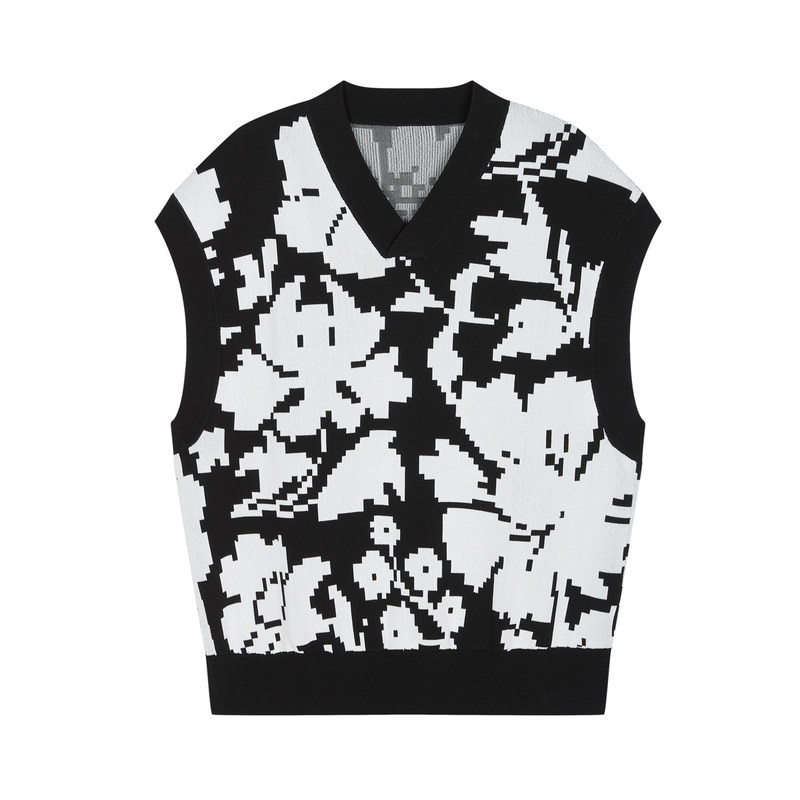速写男装秋冬新款休闲宽松无袖毛衫印花针织背心V领时尚潮流上衣