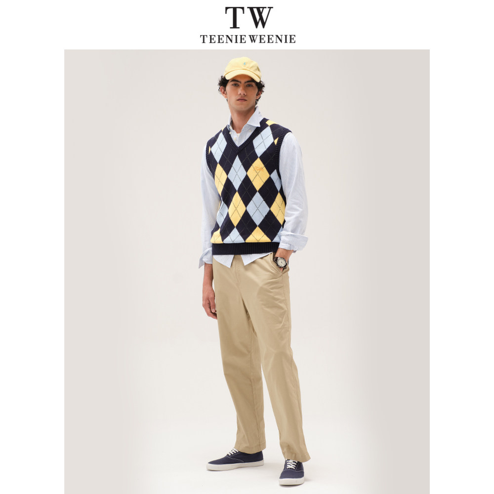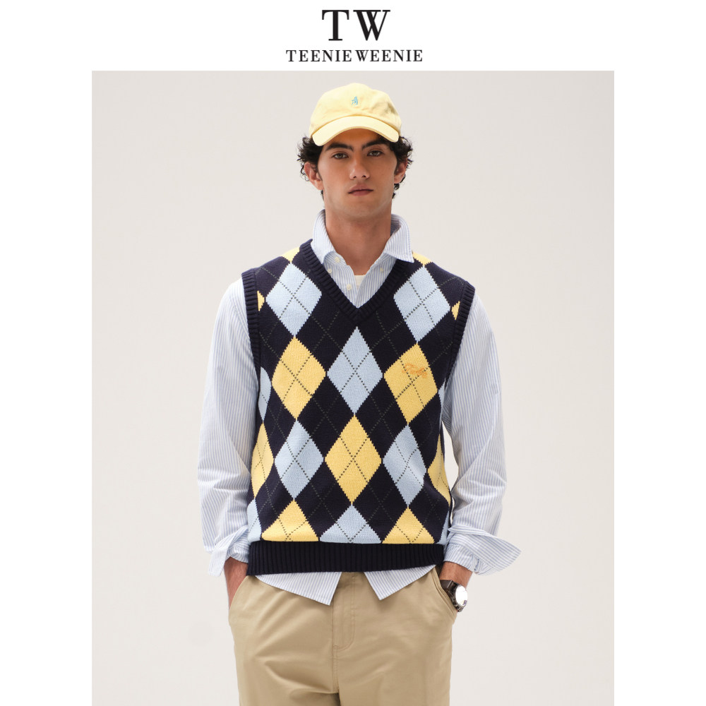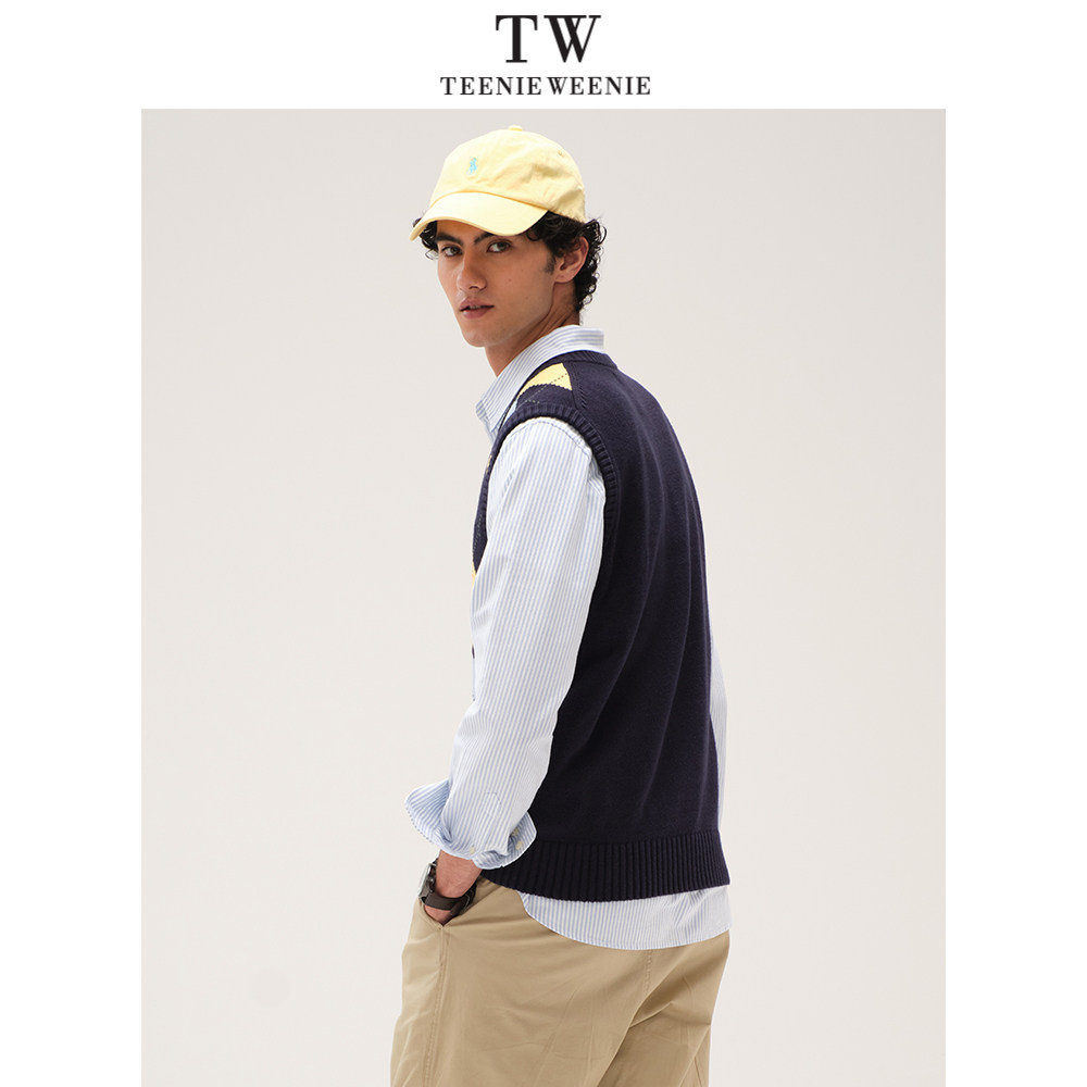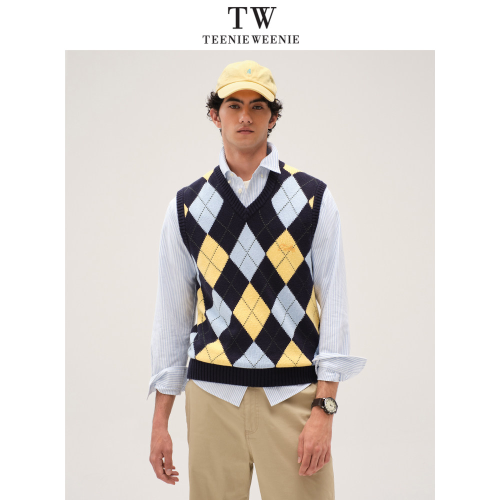 TeenieWeenie小熊男装撞色格纹毛衣2025春季新款简约V领复古背心