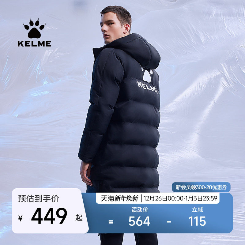 KELME卡尔美长款运动棉衣男冬季新款过膝连帽足球大衣保暖棉服厚