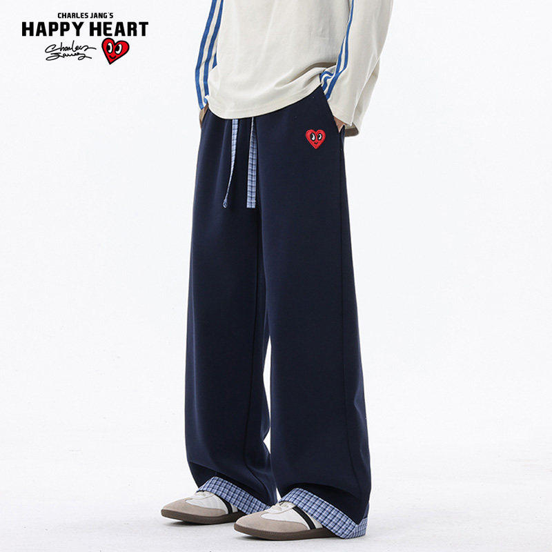 查尔斯桃心 美式拼色格纹裤子男春秋季新款宽松阔腿直筒休闲长裤
