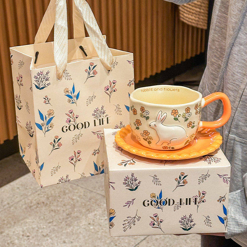 ins可爱花丛兔咖啡杯碟礼盒套装设计感陶瓷马克杯送女生生日礼物