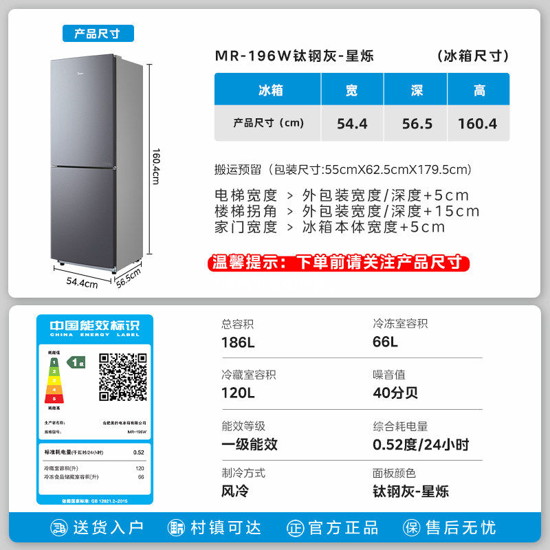 美的195/180+超薄双开两门家用小户型出租屋冰箱节能省电风冷无霜
