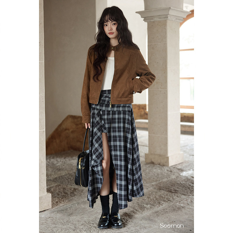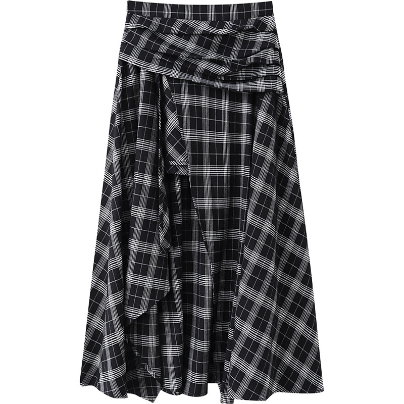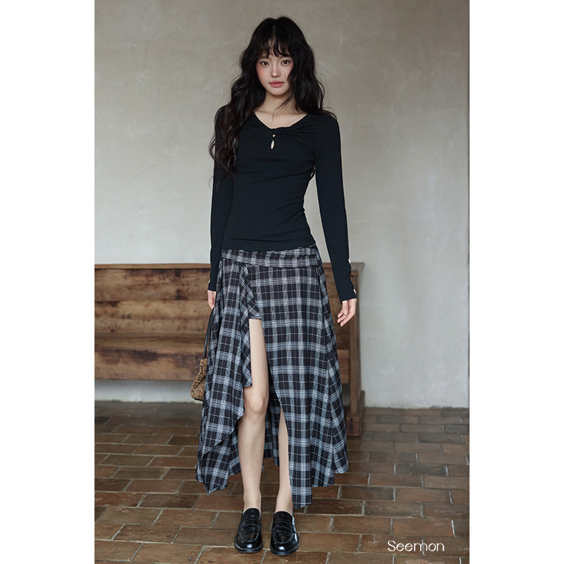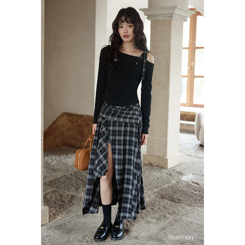 夕蒙2025新款秋韩系气质裙子小个子小众设计感不规则黑格半身裙女