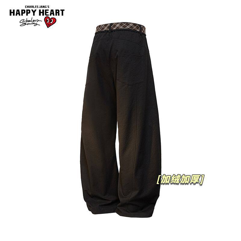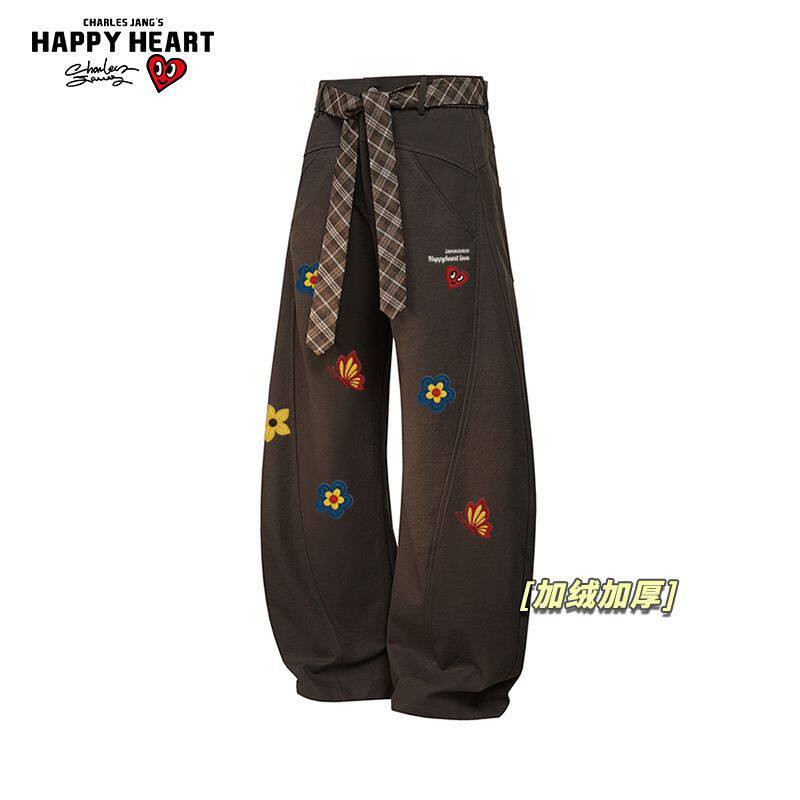 查尔斯桃心花卉印花弯刀裤加绒加厚男女冬季宽松直筒休闲长裤子潮