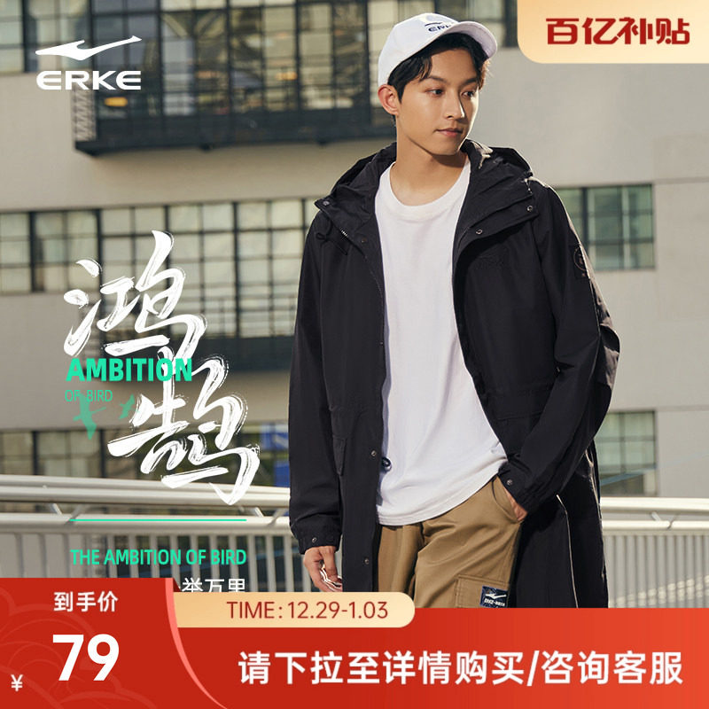 鸿鹄丨鸿星尔克风衣男冬季男士国潮复古中长款防风运动外套大衣男