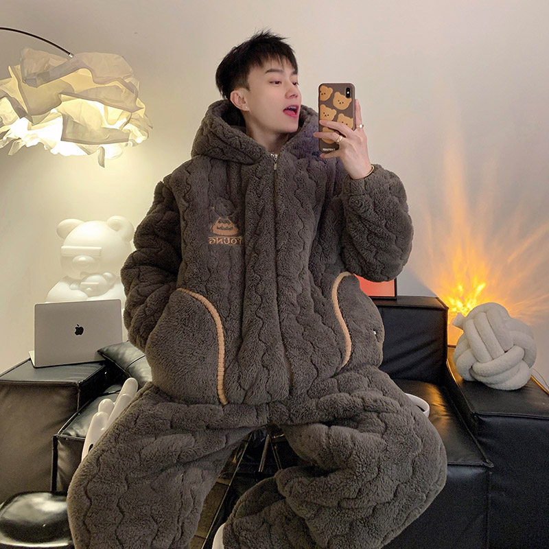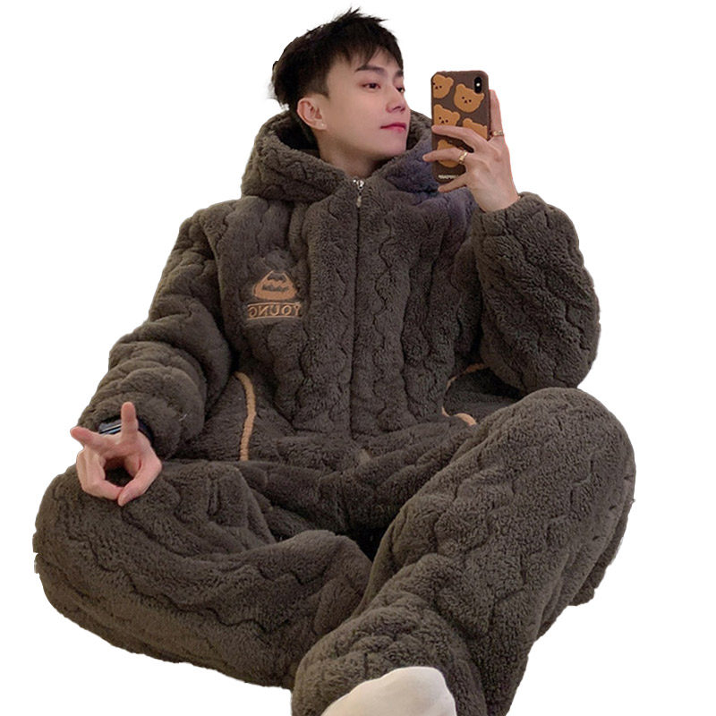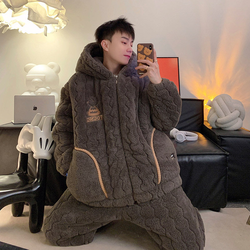 三层夹棉男士睡衣男款冬季加厚加绒珊瑚绒2025新款冬天连帽家居服