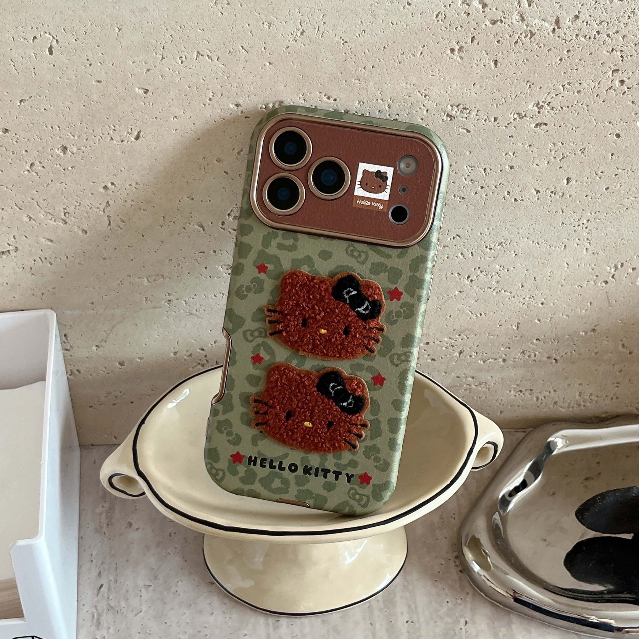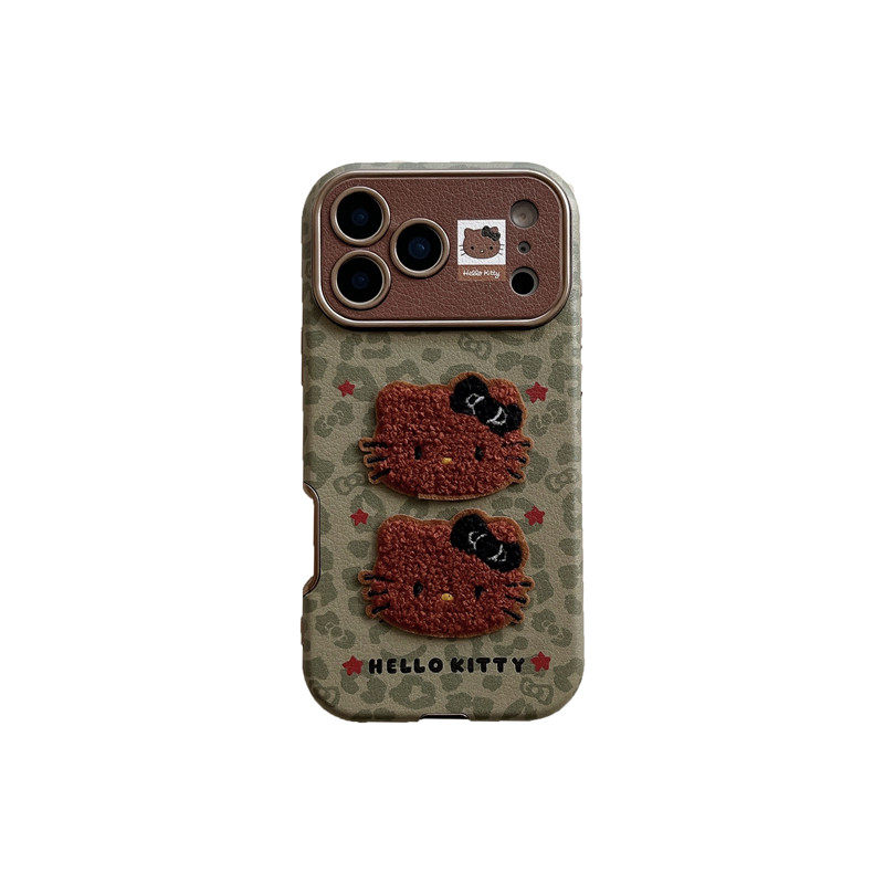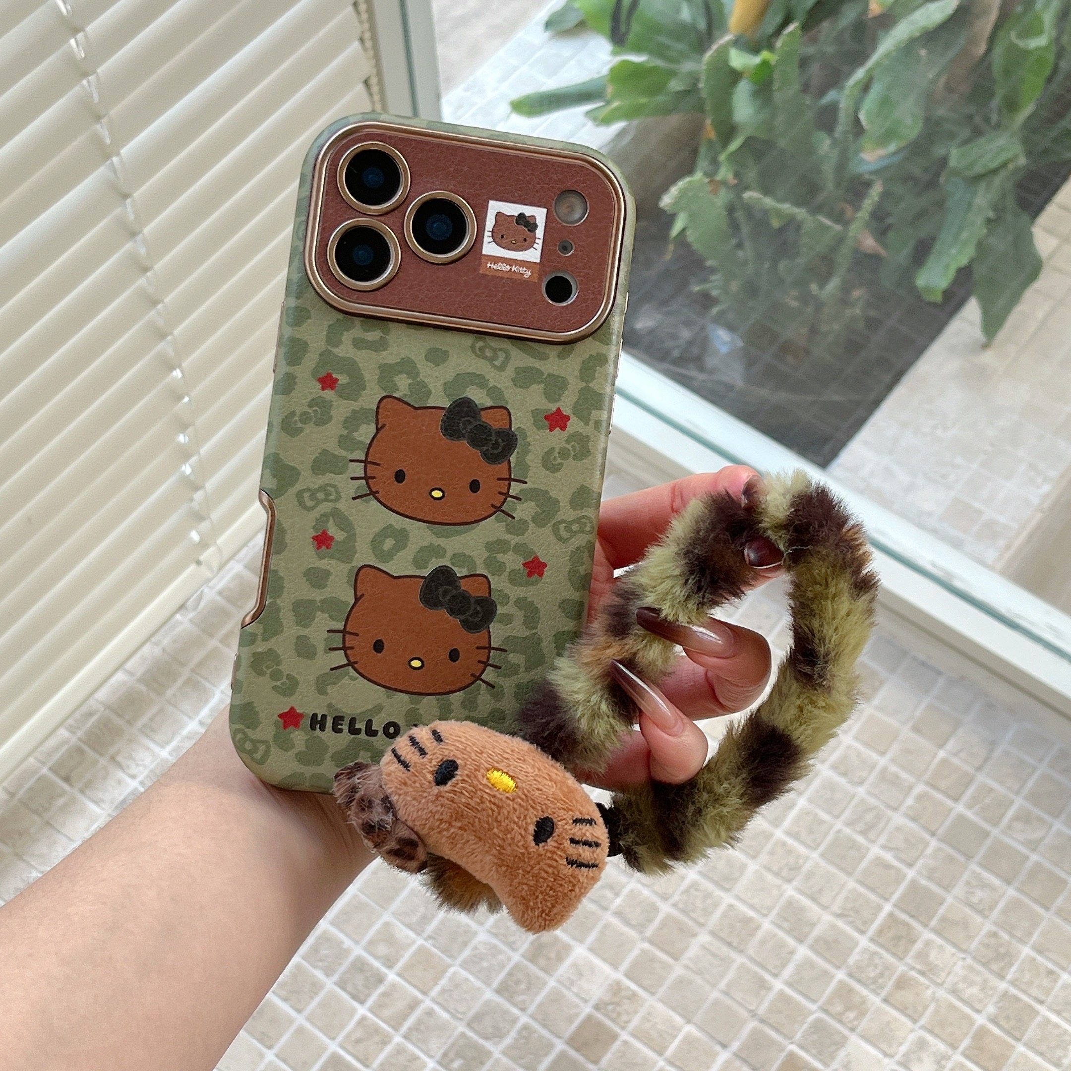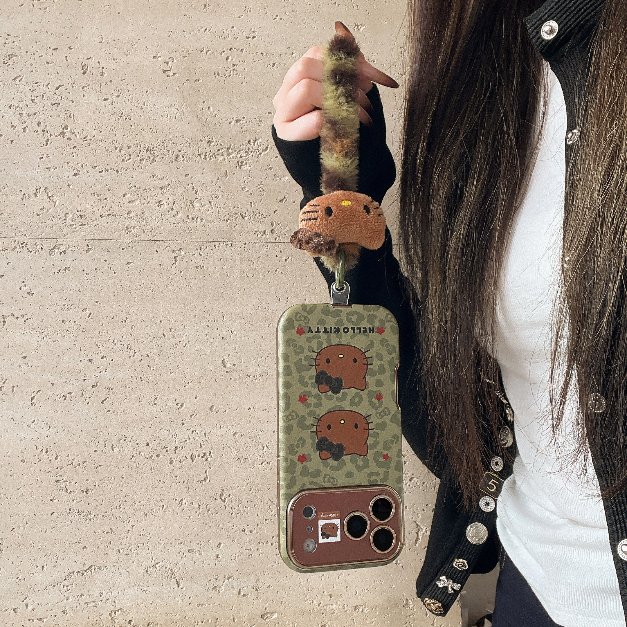日本HelloKitty豹纹绿色凯蒂猫适用iPhone17Pro手机壳卡通可爱毛绒公仔苹果16promax保护套i15外壳贴皮14软壳