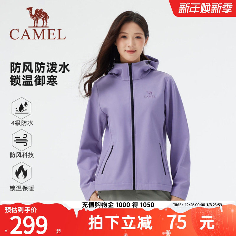 骆驼女装软壳衣防泼水外套2025春秋新款防风加绒短款连帽休闲外套