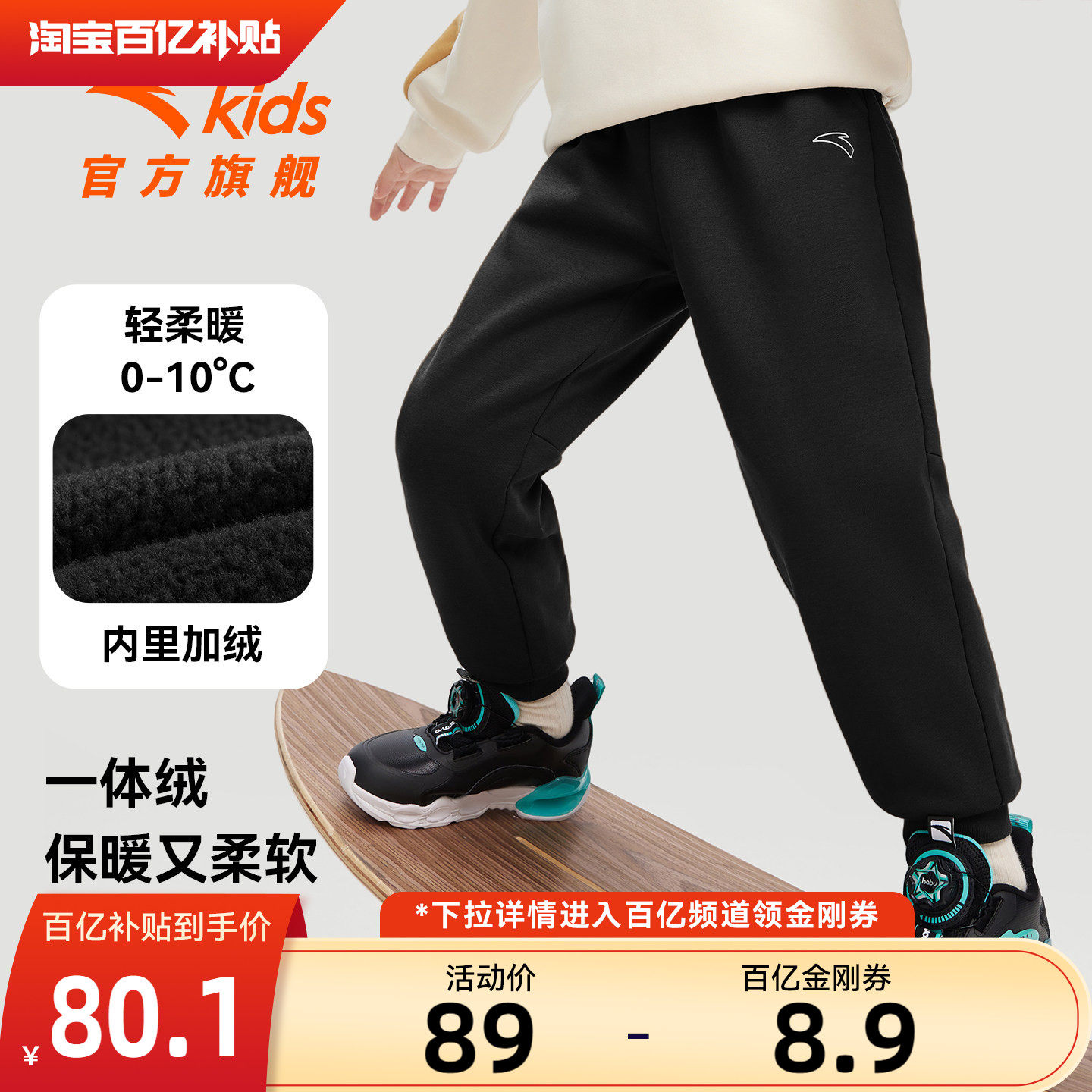 安踏儿童装男童加绒裤子一体绒秋冬款2025冬季新款卫裤长裤运动裤