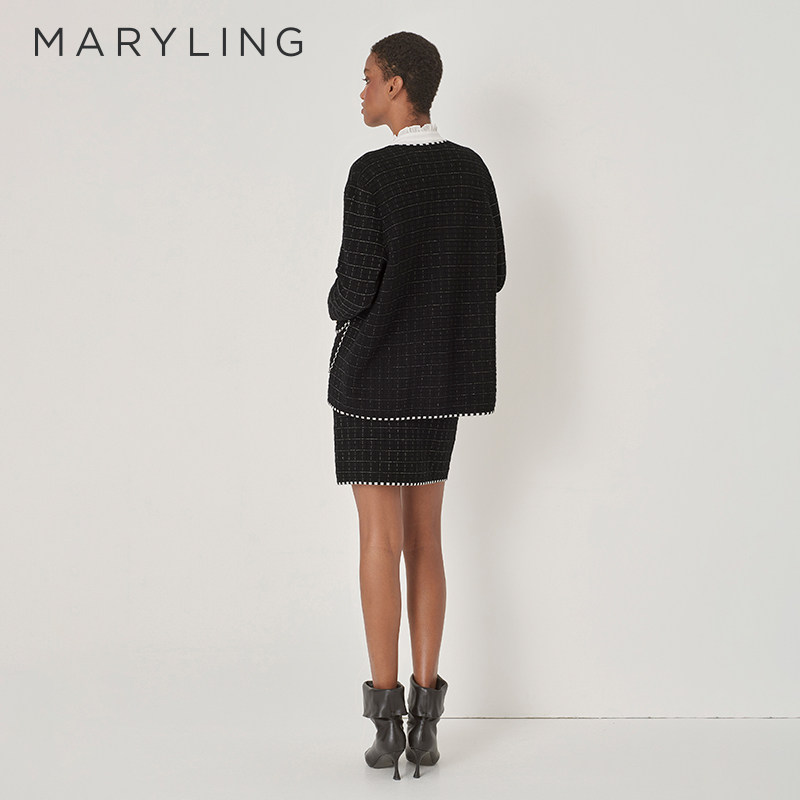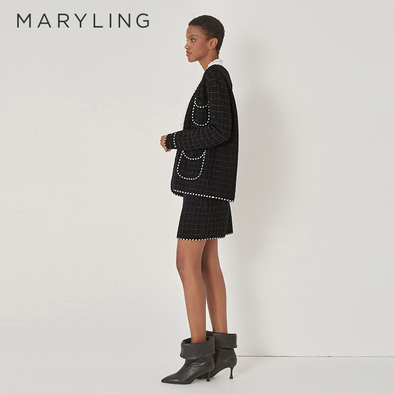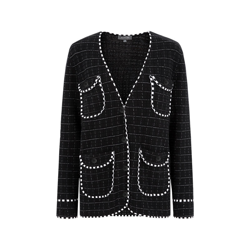 MARYLING玛俪琳秋季新品黑白方格多口袋羊毛针织开衫小香风上衣