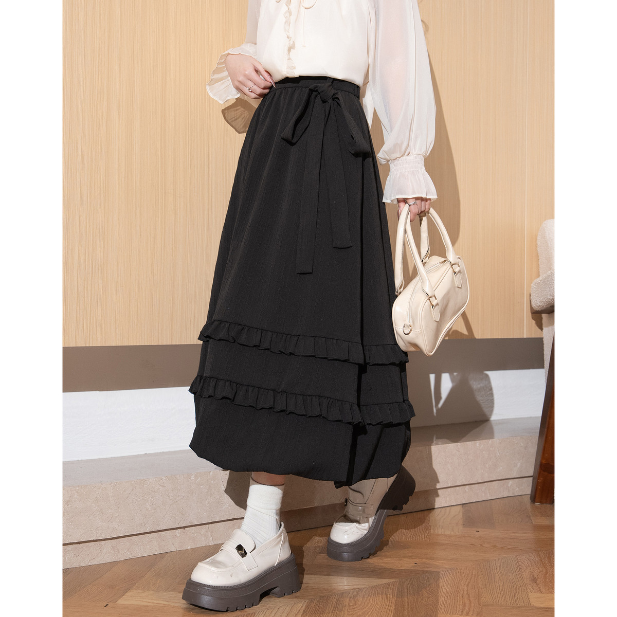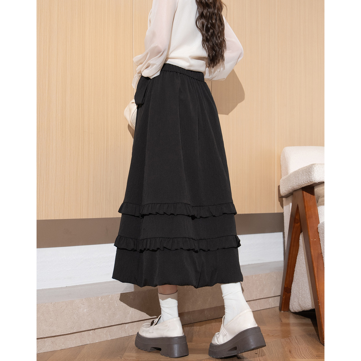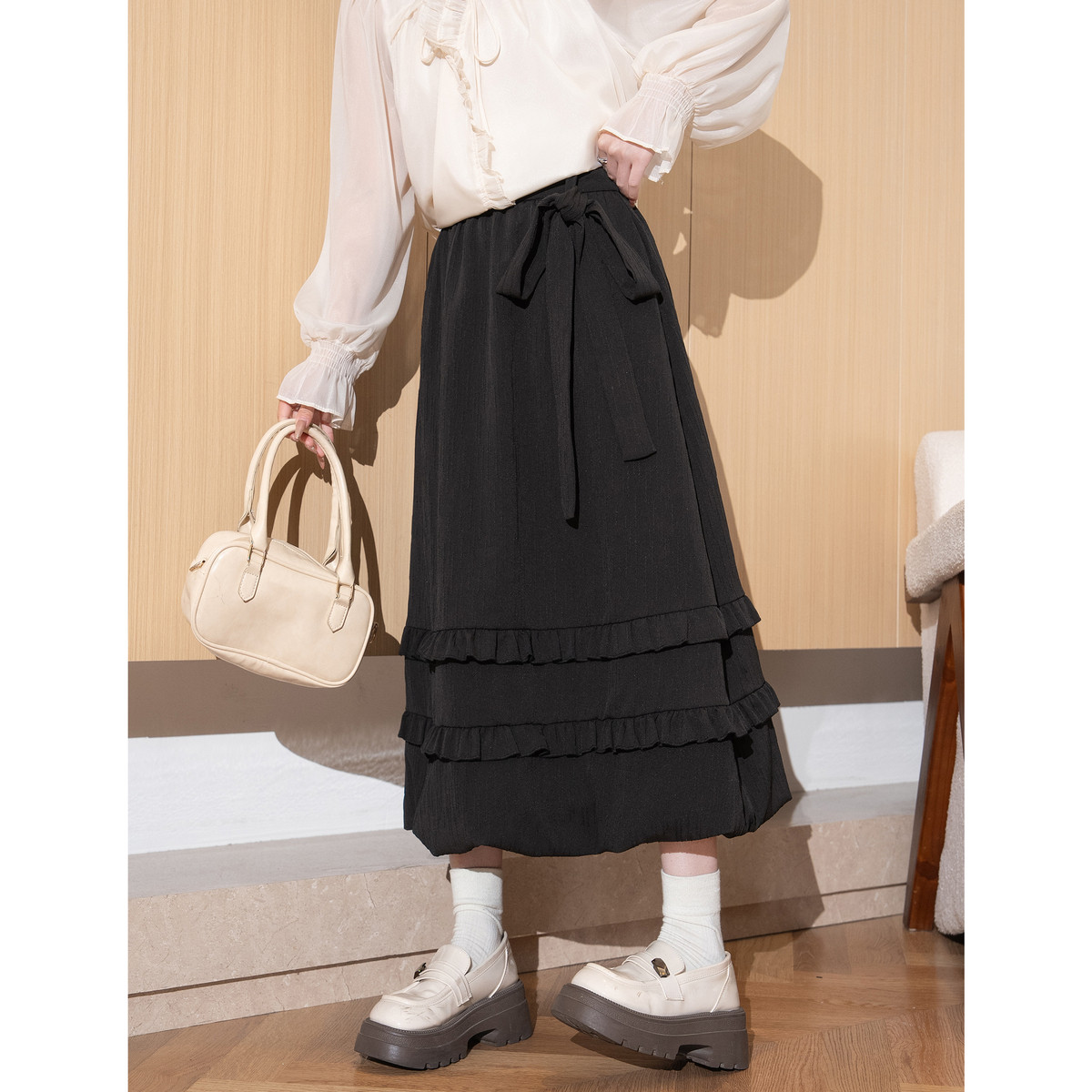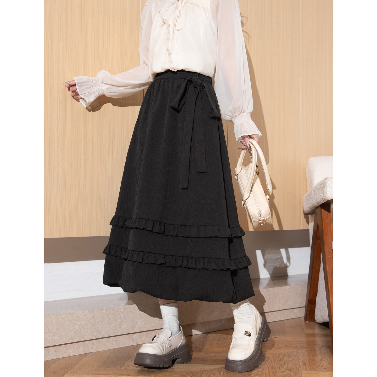唐狮秋冬女花边花苞半身裙女冬季高级感小个子显瘦黑色裙子女TD