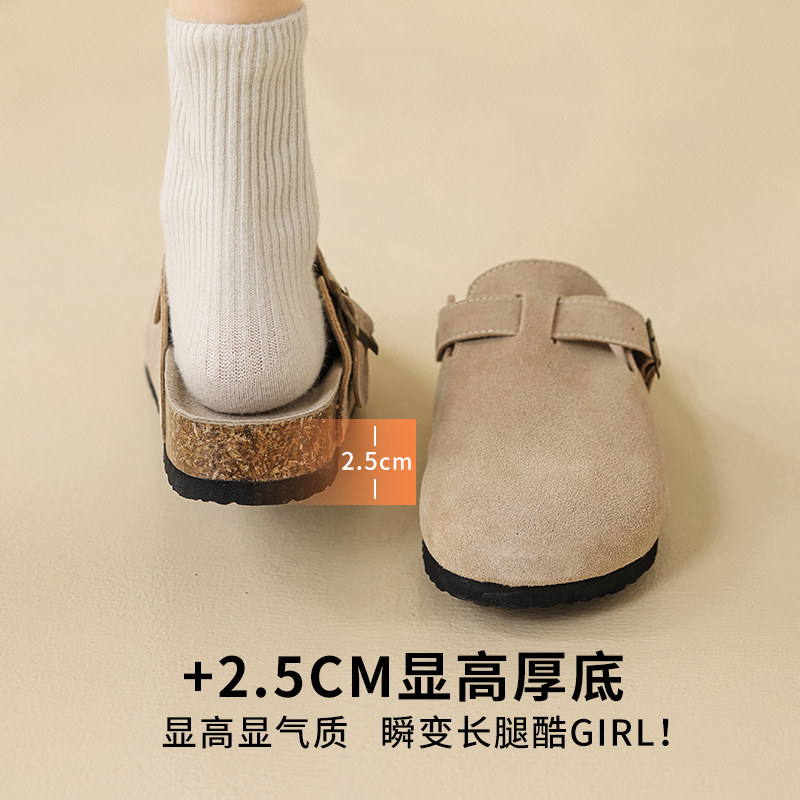 内增高6cm~厚底真皮勃肯鞋女2025秋冬新款真皮包头半拖鞋女外穿