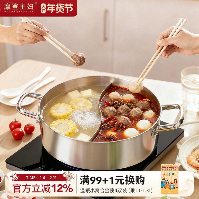 摩登主妇304不锈钢鸳鸯锅火锅专用盆家用汤锅加厚清汤电磁炉锅具